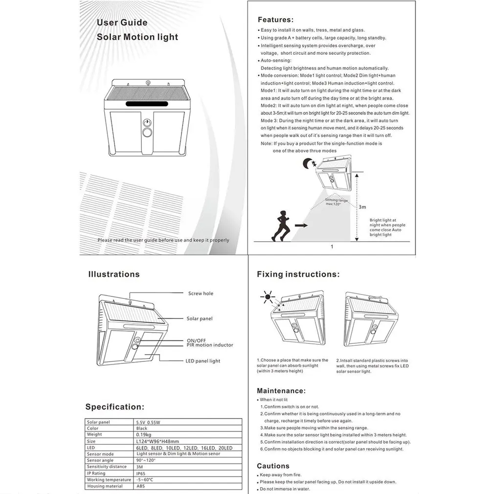 2,120 ° широкоугольное освещение: Модернизированный 146 Мощный светодиодный свет и 120 ° широкоугольное освещение, обеспечивая супер яркое освещение для широкой области. Больше солнечного света он заряжен, он может осветить дольше. Примечание: если в течение нескольких дней нет хорошего солнечного светильника, светильник может не включаться в ночное время. Он получит питание, если придет солнечный день и светильник будет работать через 8-10 часов зарядки.