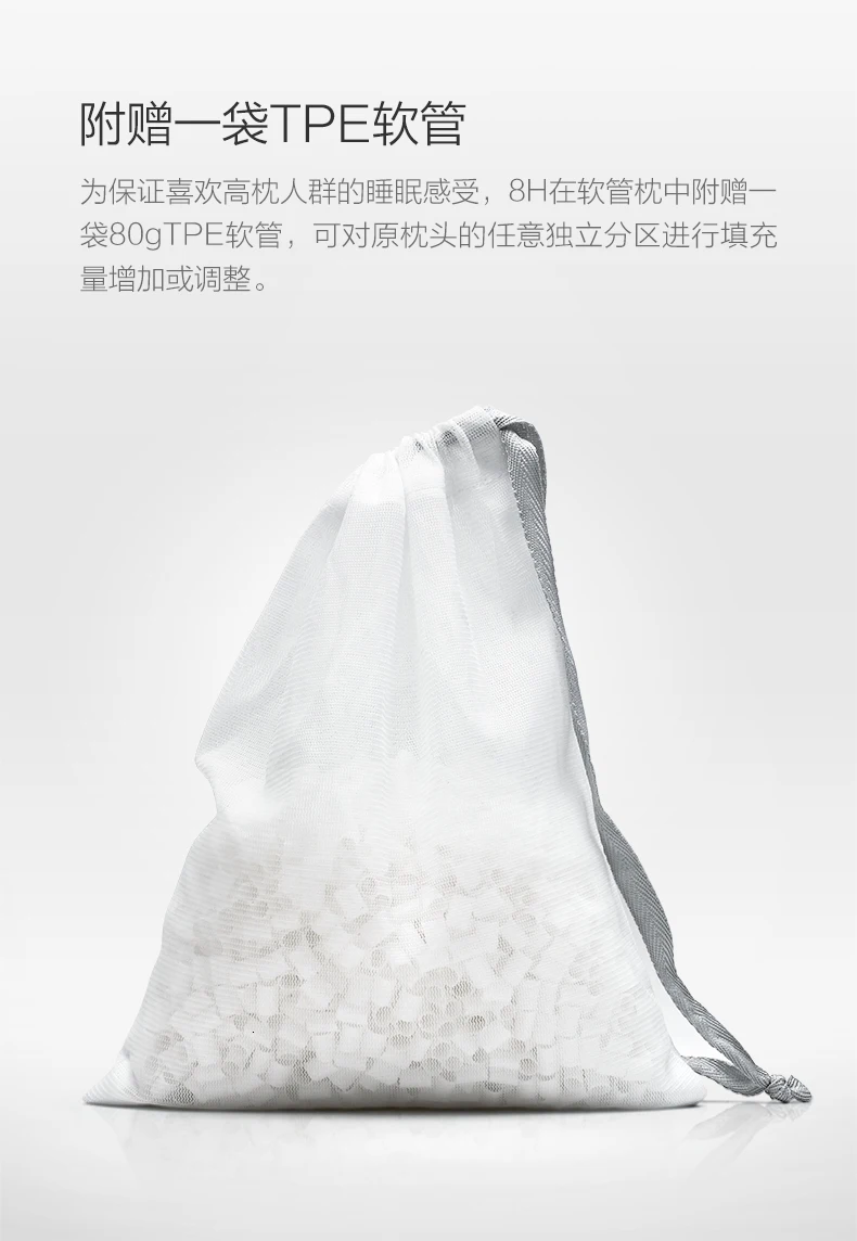 Для того, чтобы обеспечить опыт сна людей, которые любят людей с высоким потоком, 8 H поставляется с сумкой 80 gTPE шланг в подушке шланга, который может увеличить или отрегулировать количество наполнения любой отдельной перегородки оригинальной подушки.