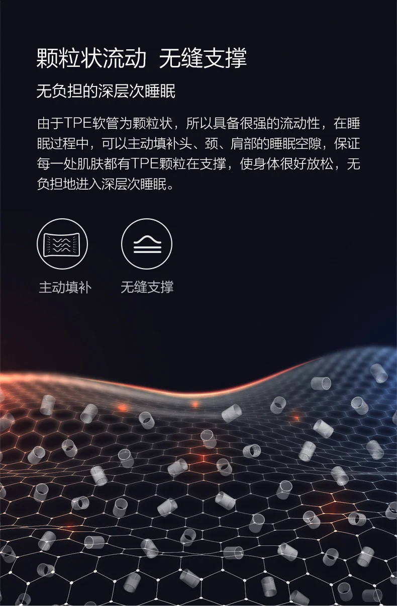 Поскольку шланг TPE ГРАНУЛИРОВАН, он имеет сильную плавность. Во время сна он может активно заполнять спальное пространство головы, шеи и плеч, обеспечивая, что каждая кожа имеет частицы TPE в опоре, что делает тело очень хорошим. Расслабьтесь и погрузитесь в глубокий сон без нагрузки