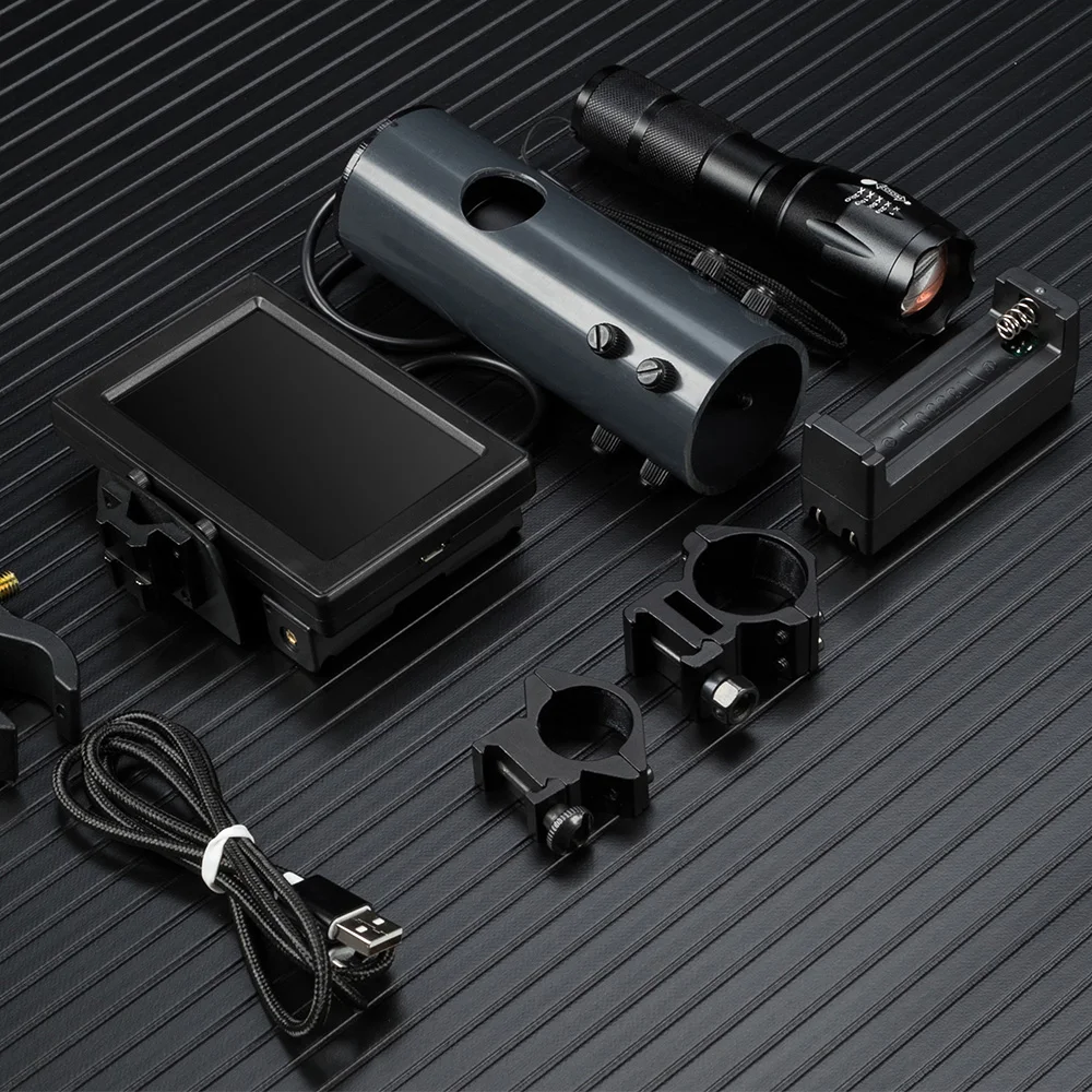 Посылка список: 1 х HD Камера 1 х окуляр трубки 1 х Камуфляжная Лента (случайный цвет) 1x4,3 дюймовый экран дисплея 1 фонарик (новые или старые модели отправляются случайным образом) 2 крепления (25 мм/30 мм) 1 x Инфракрасный фонарик Зарядное устройство-1 шт.;