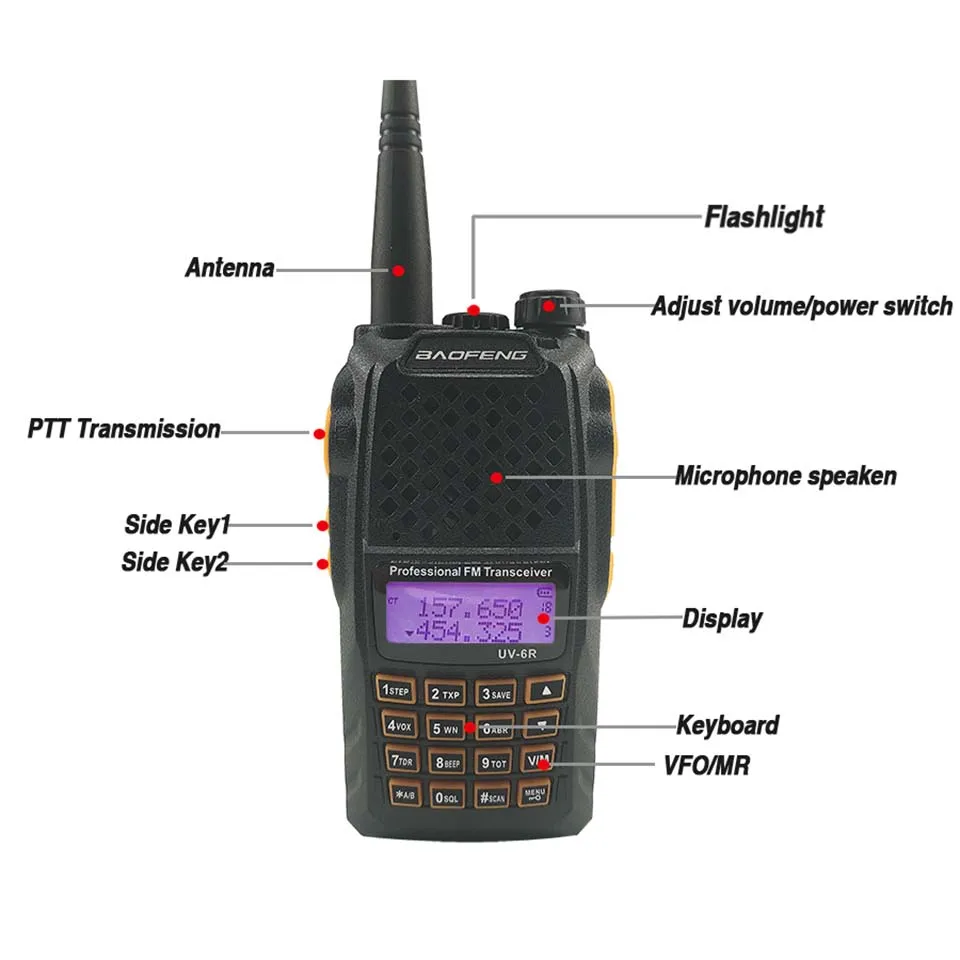 Интеллигентая (ый) дизайн. Двухдиапазонный портативный трансивер с функцией ЖК-дисплея. Коммерческий fm-радиоприемник (65 МГц ~ 108 МГц). Включает 105 кодов "DCS" и 50 кодов конфиденциальности "CTCSS" программируемые. 6 выбираемых шагов частоты (2,5/5/6.25/10/12.5/20/25 кГц) Функция VOX(vioce управляемая передача). DTMF кодировкой. Функция аварийной сигнализации. До 128 каналов памяти. Широкополосный (широкий)/Узкий (узкий) выбор. Высокая мощность (5 Вт)/низкая мощность (1 Вт) выбирается. Подсветка дисплея и программируемая клавиатура. Функция «звуковой сигнал» на клавиатуре. Двойные часы/двойной прием. Функция «офсетная» (Смещение частоты для доступа ретранслятора) Программируемый таймер передачи "TOT". Выбор режима сканирования. Функция блокировки "BCL" Программируемая на ПК. Встроенный светодиодный фонарик. Встроенный RX CTCSS/DCX сканирование. Для экономии заряда аккумулятора. Пороговое значение уровня «щель» регулируется от 0 до 9. Поперечный ленточный прием/передача. Тональный конец передачи. Встроенный замок для ключей.Посылка включает в себя