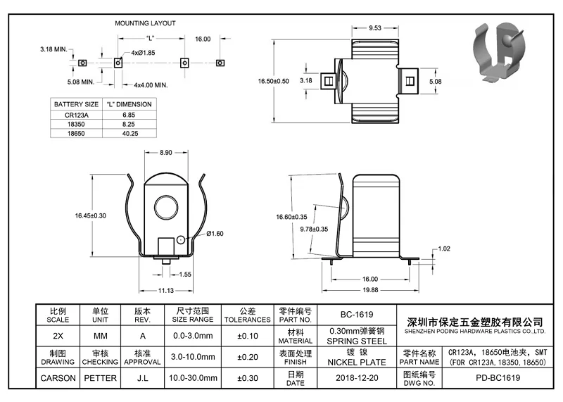 Номер детали: BC-1619 Название продукта: зажим для аккумулятора Материал: пружинная сталь 0,3 мм Отделка/покрытие: никелевая пластина Стиль крепления: SMT Вес единицы: 1,62 г Информация об аккумуляторах: 18350,18550,18650,17335,CR123A Упаковка: свободная