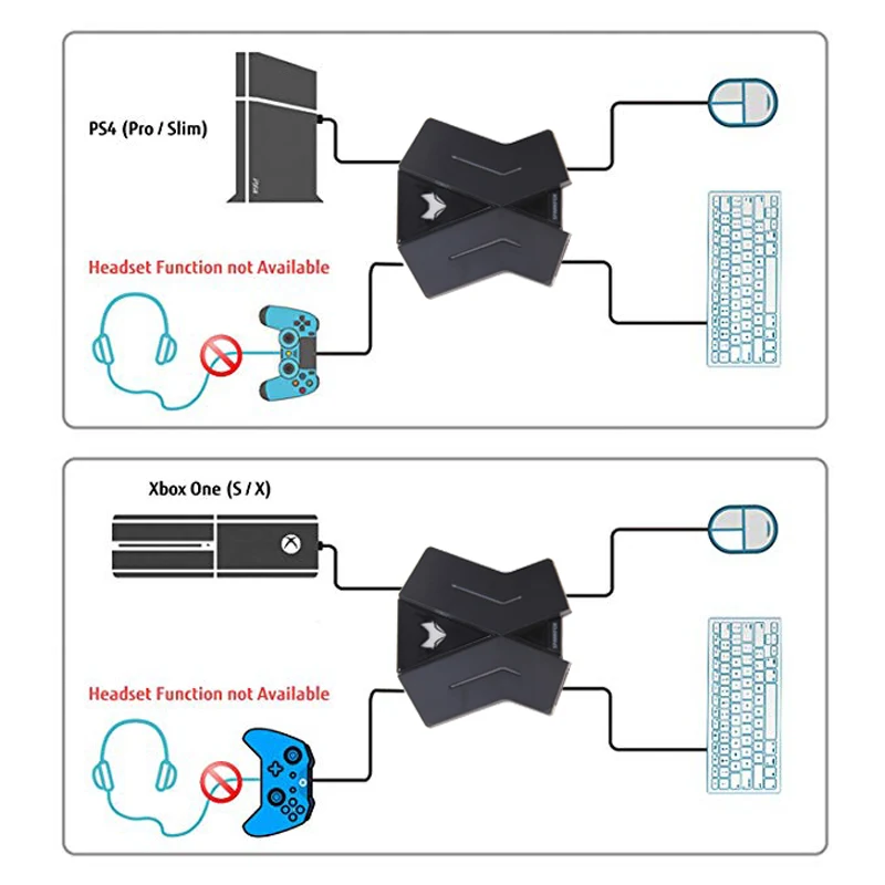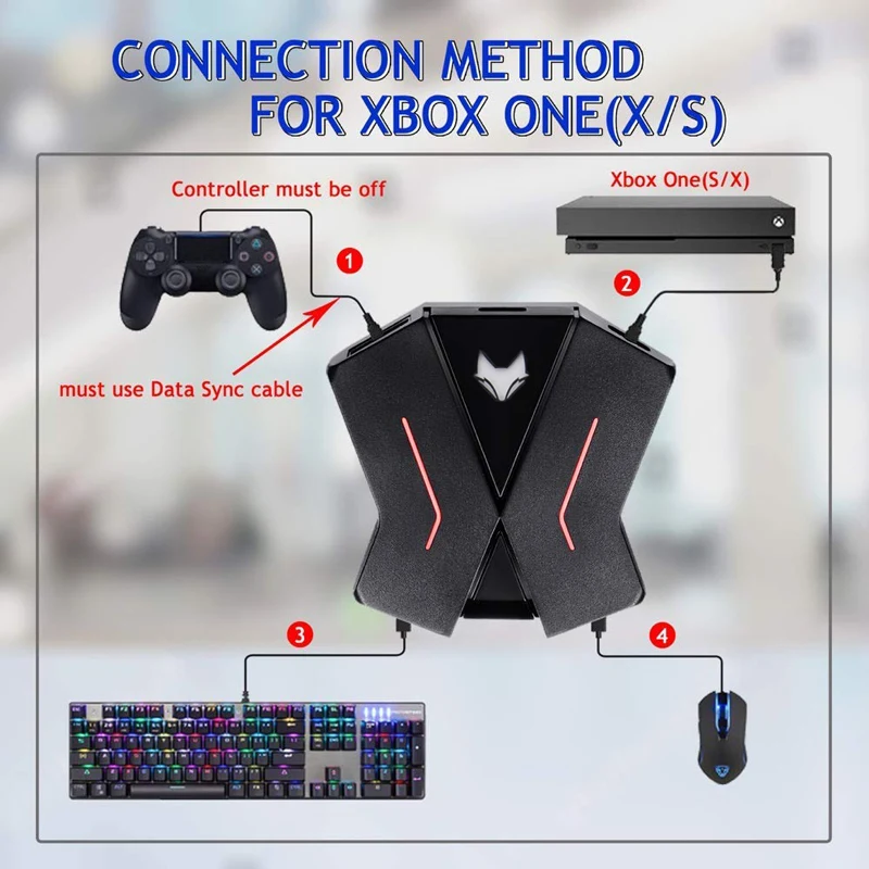 --- Способ подключения для этого адаптера клавиатуры PS4/адаптера клавиатуры Xbox очень прост, нет необходимости управлять, подключать и играть. Однако следует отметить, что при подключении к консолям PS4 и Xbox One необходимо загрузиться с оригинальным контроллером и оригинальным кабелем передачи данных. Другие вечерние аксессуары могут привести к потере соединения.