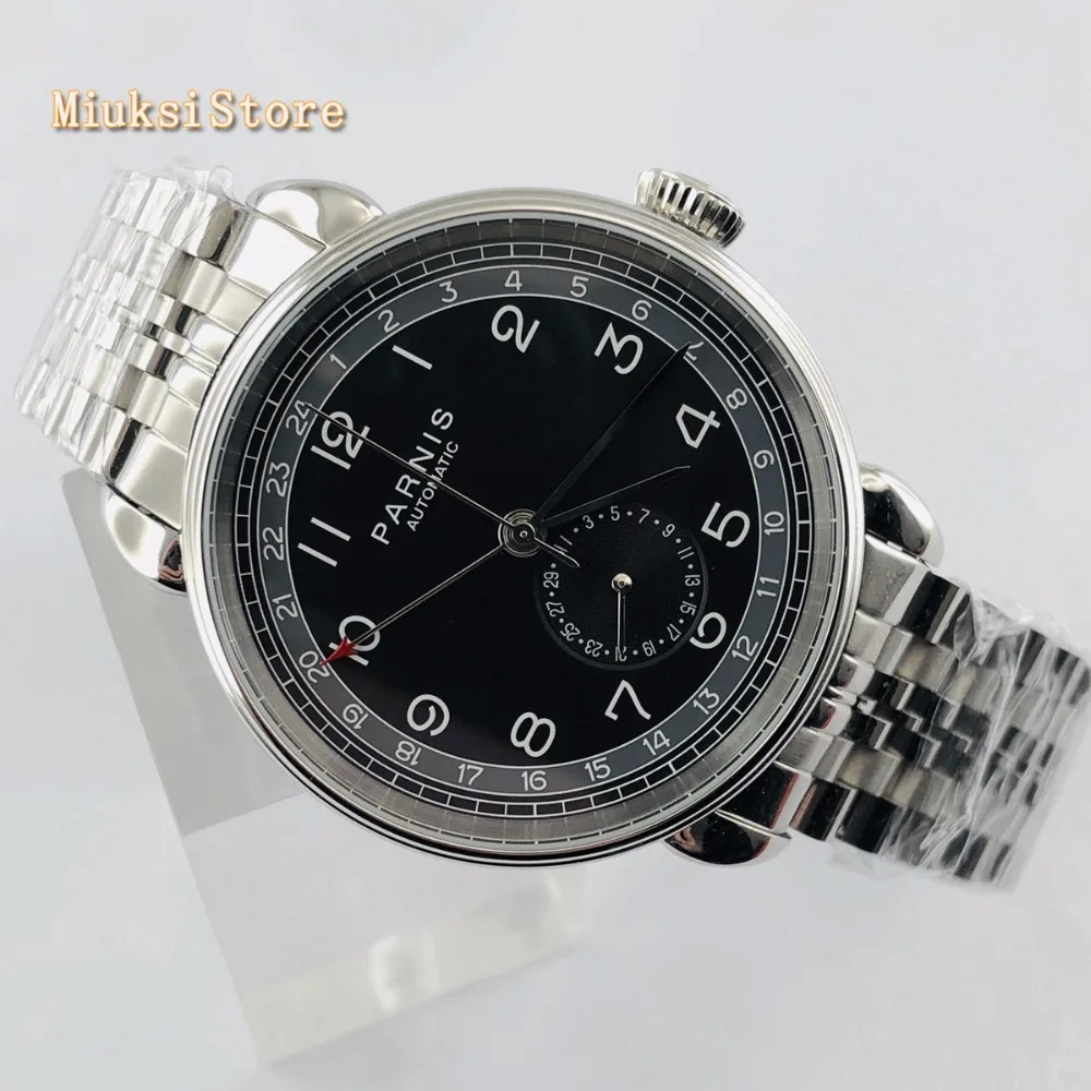 Мужские автоматические механические часы Parnis, серебристый чехол 42 мм с черным циферблатом GMT arab mark, мужские часы с окошком даты