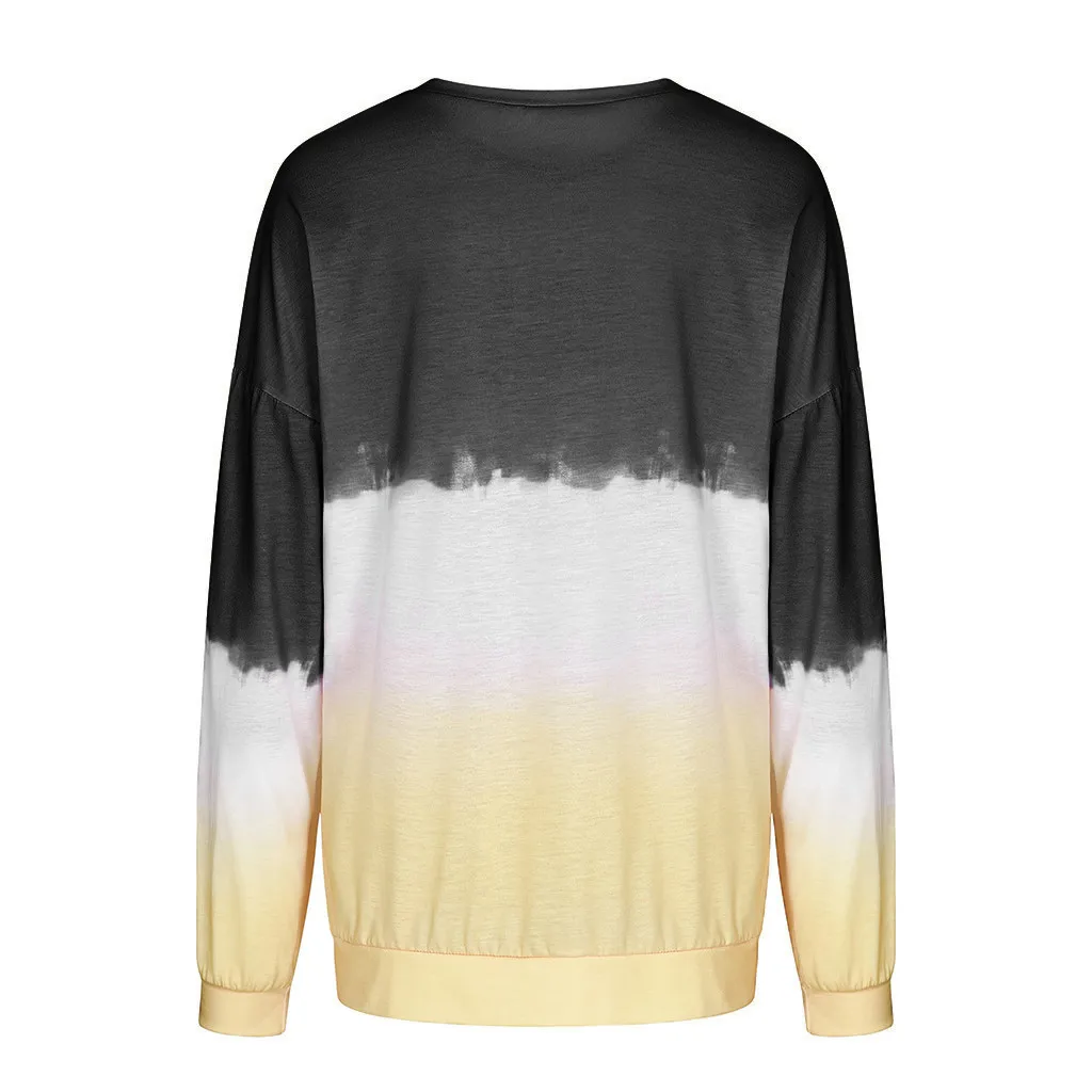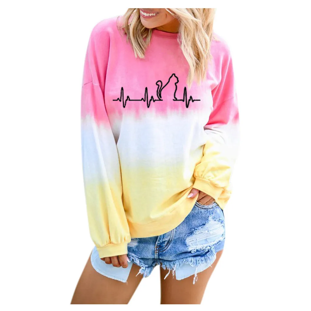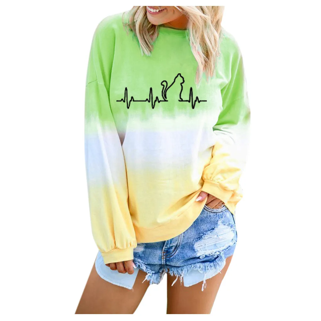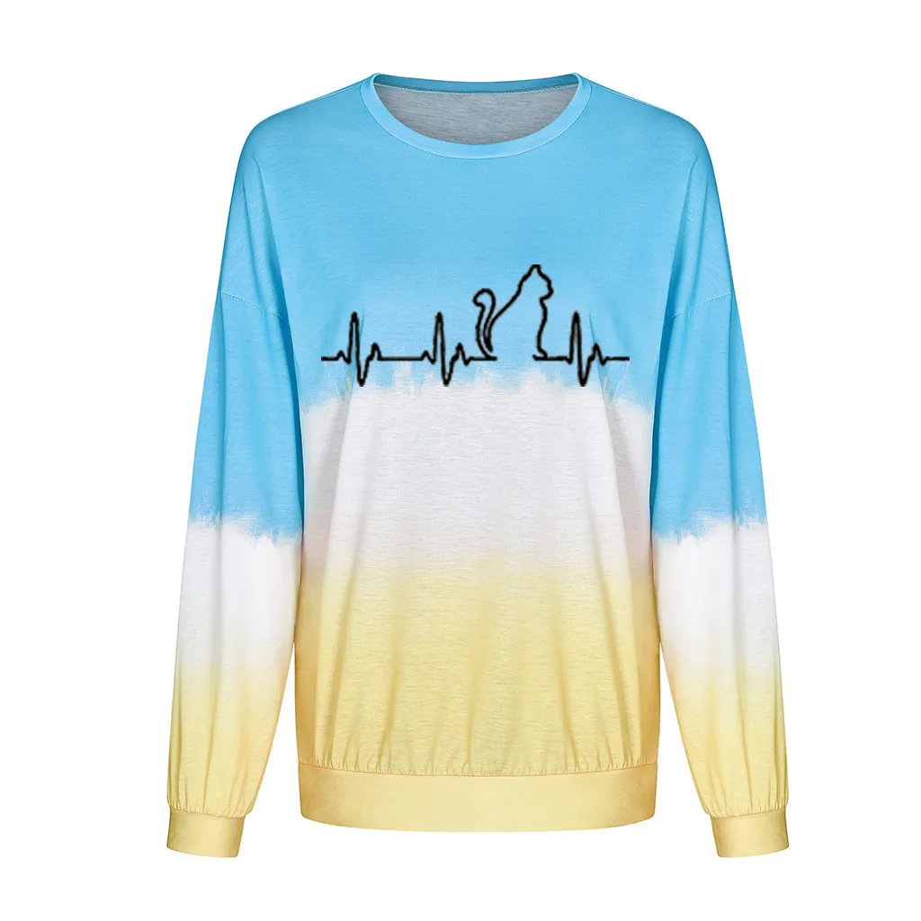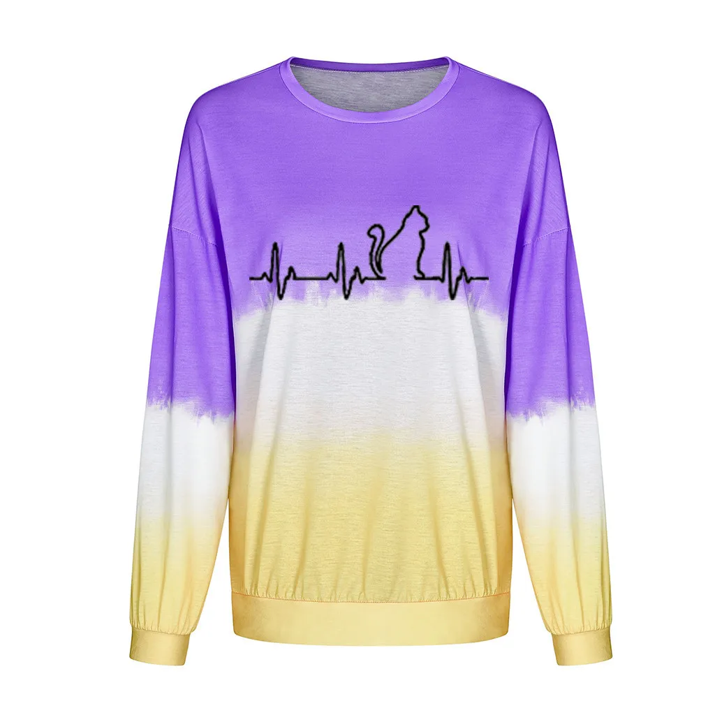 Женский градиентный Контрастный ЦВЕТНОЙ топ с принтом кота и длинным рукавом, пуловер, толстовка