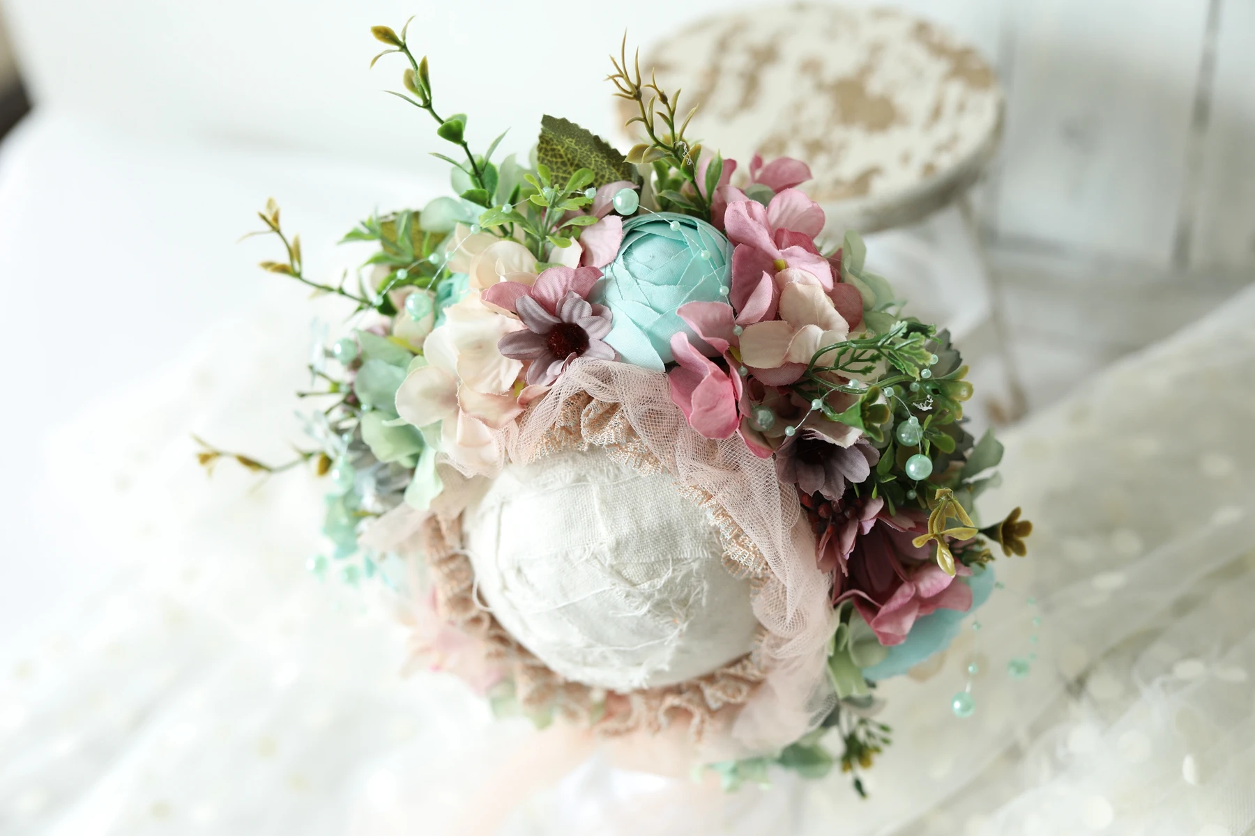 Красивый садовый капота. Мягкая Кепка, украшенный мамам, ranunculuses, гортензии, зелени и бусинами. Идеальный летнего и осеннего цвета.