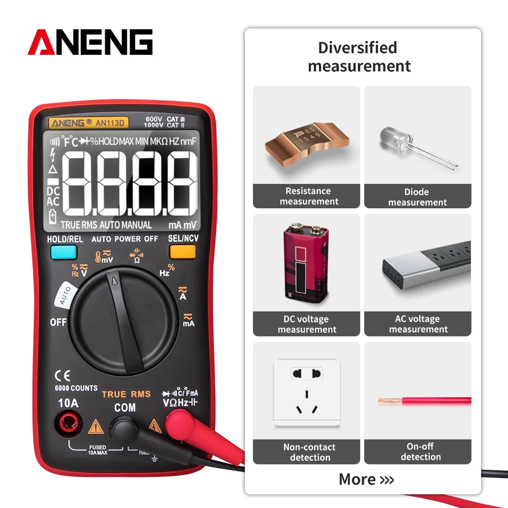 -Функции измерения включают напряжение переменного/постоянного тока, ток переменного/постоянного тока, сопротивление, диодный тест/непрерывность, NCV, частоту/рабочий цикл, емкость.