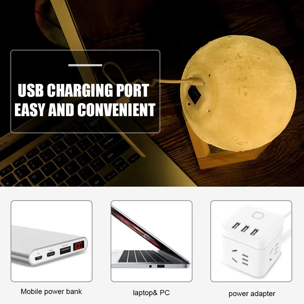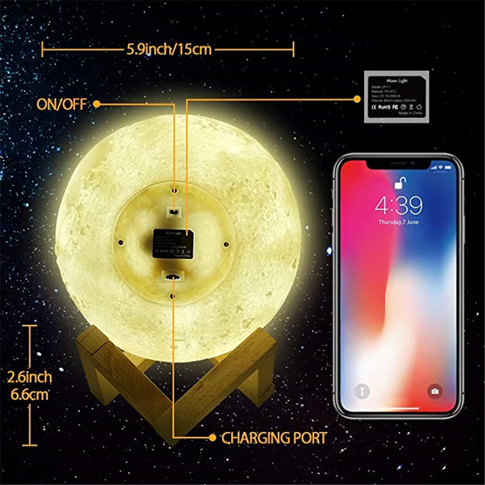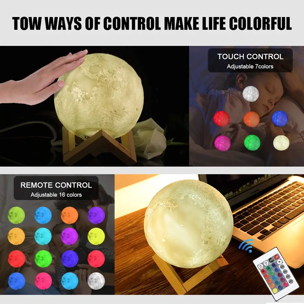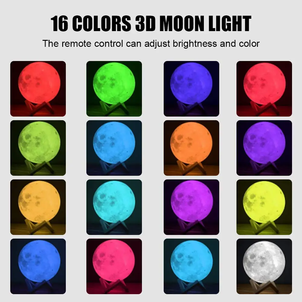 Лунный светильник с 3D принтом, ночник, светильник USB, перезаряжаемый, с сенсорным управлением, 16 цветов, светодиодный светильник, подарок с пультом дистанционного управления