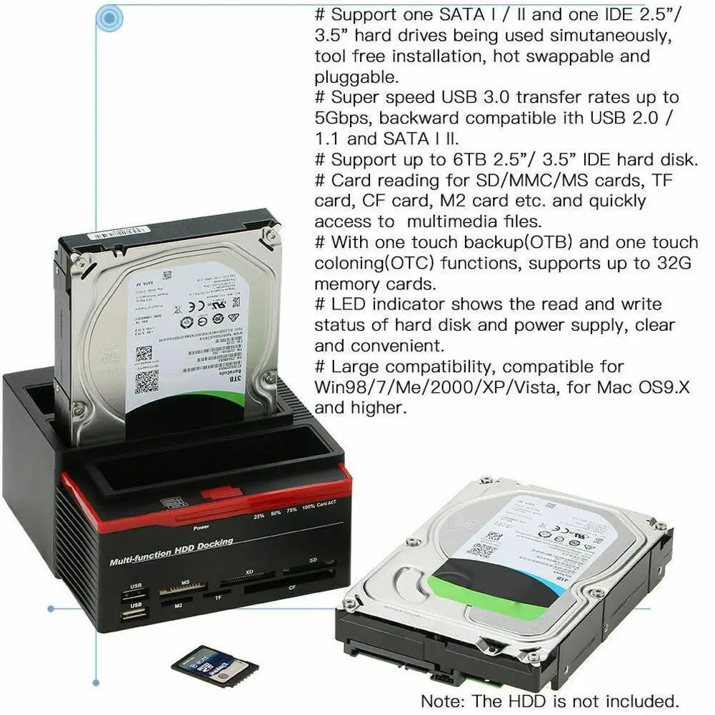 * 3 слота тройной стыковки (2 слота SATA и 1 слот IDE). Функцией клонирования. 2 порта USB 2,0 хаб. MS/M2/XD/CF/SD/TF кард-ридер.