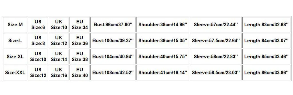 Пожалуйста, сравните детальные размеры с вашими перед покупкой! Цвета могут немного отличаться в зависимости от настроек компьютера и монитора Возможны незначительные отклонения в размере на 1-3 см разницу в размерах ввиду того, что Замеры производились вручную, спасибо (все размеры указаны в см, обратите внимание: 1 см = 0,39 дюйма) Таблица размеров: Размер Американский размер Размер Великобритании Европейский размер Бюст Плечо Рукав Длина М 6 10 34 96 см/37,80'' 38 см/14,96'' 57 см/22,44'' 83 см/32,68'' L 8 12 36 100 см/39,37'' 39 см/15,35'' 57,5 см/22,64'' 84 см/33,07'' XL 10 14 38 104 см/40,94'' 40 см/15,75'' 58 см/22,83'' 85 см/33,46'' XXL 12 16 40 108 см/42,52'' 41 см/16,14'' 58,5 см/23,03'' 86 см/33,86''