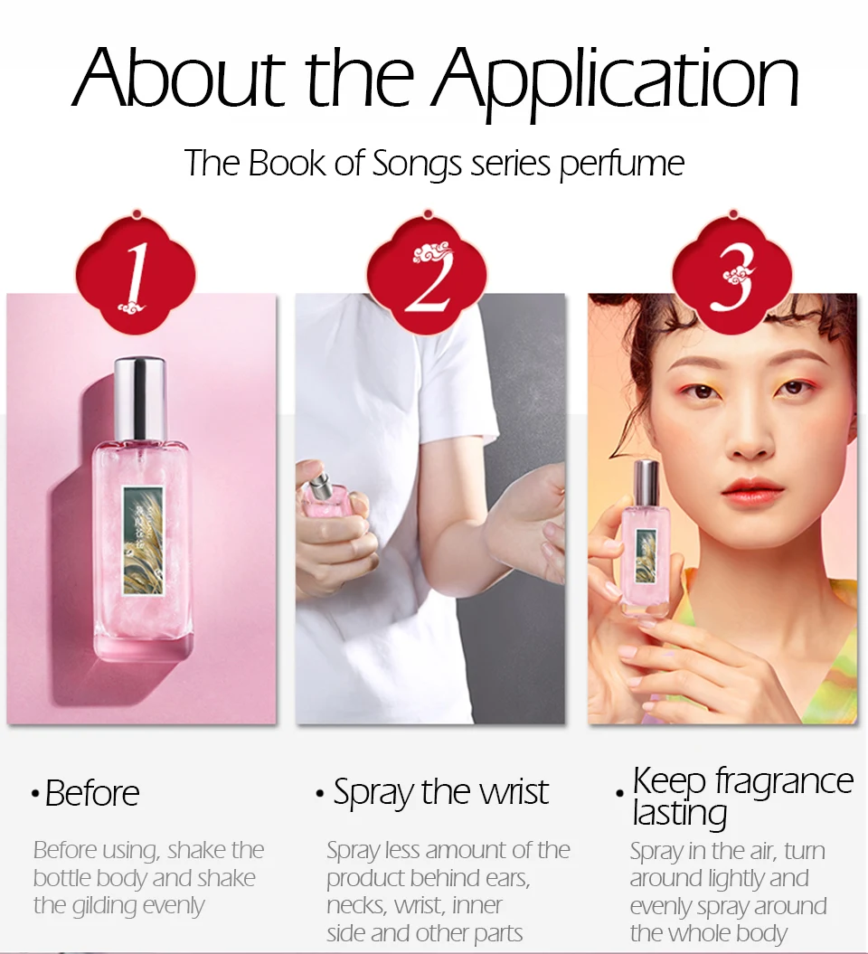 О применении Парфюмерия серии «Книга песен» перед использованием встряхните корпус бутылки и равномерно встряхните позолоту распылите запястье меньше количества продукта за ушами, шеями, запястьем, внутренняя сторона и другие части. Сохраняйте стойкий аромат спрея в воздухе, слегка повернитесь и равномерно распылите вокруг всего тела. Ноты парфюма жемчужный блеск слюда порошок. После незаметного размещения в течение определенного периода, он будет осажден на дно бутылки. Это очень часто. Равномерно встряхните перед распылением.