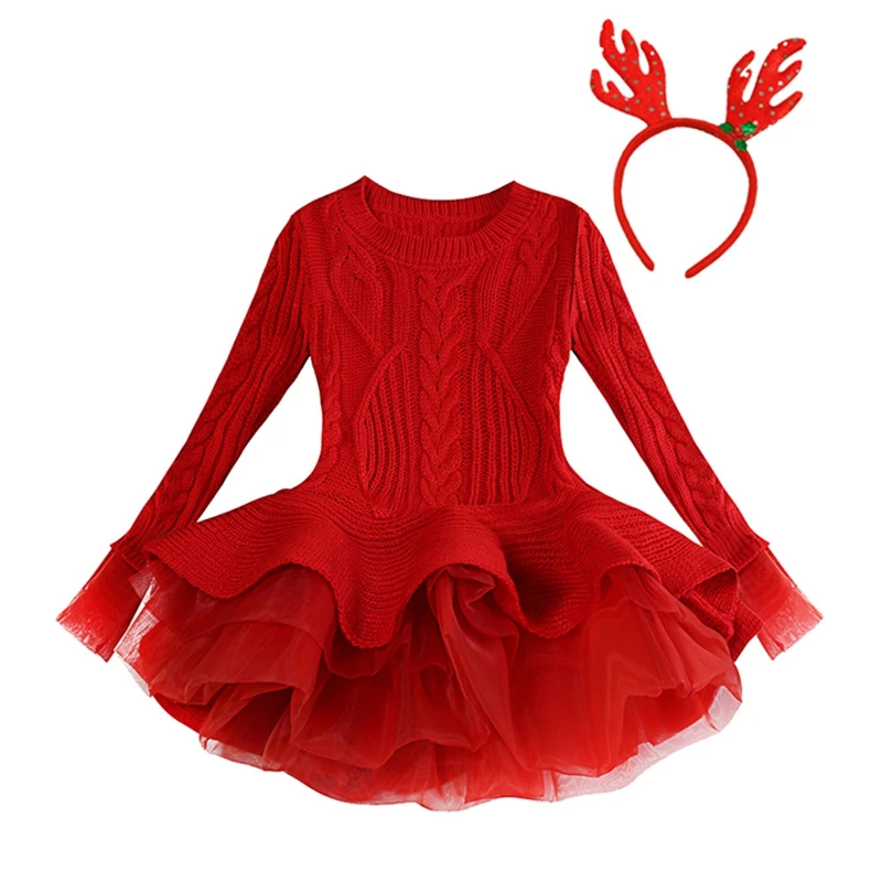 Детское рождественское платье-свитер для маленьких девочек, повязка на голову, зимние теплые однотонные вязаные платья принцессы для вечеринки, свадьбы, Vestido