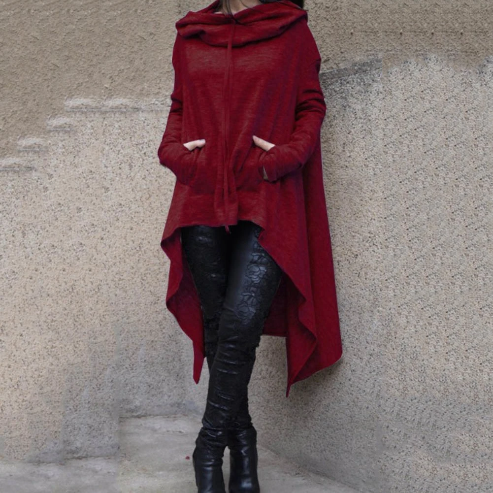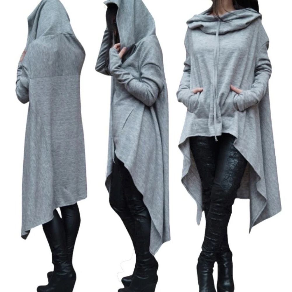 Women Solid Color Asymmetric Hem Drawstring Hooded Sweatshirt Loose Poncho Coat