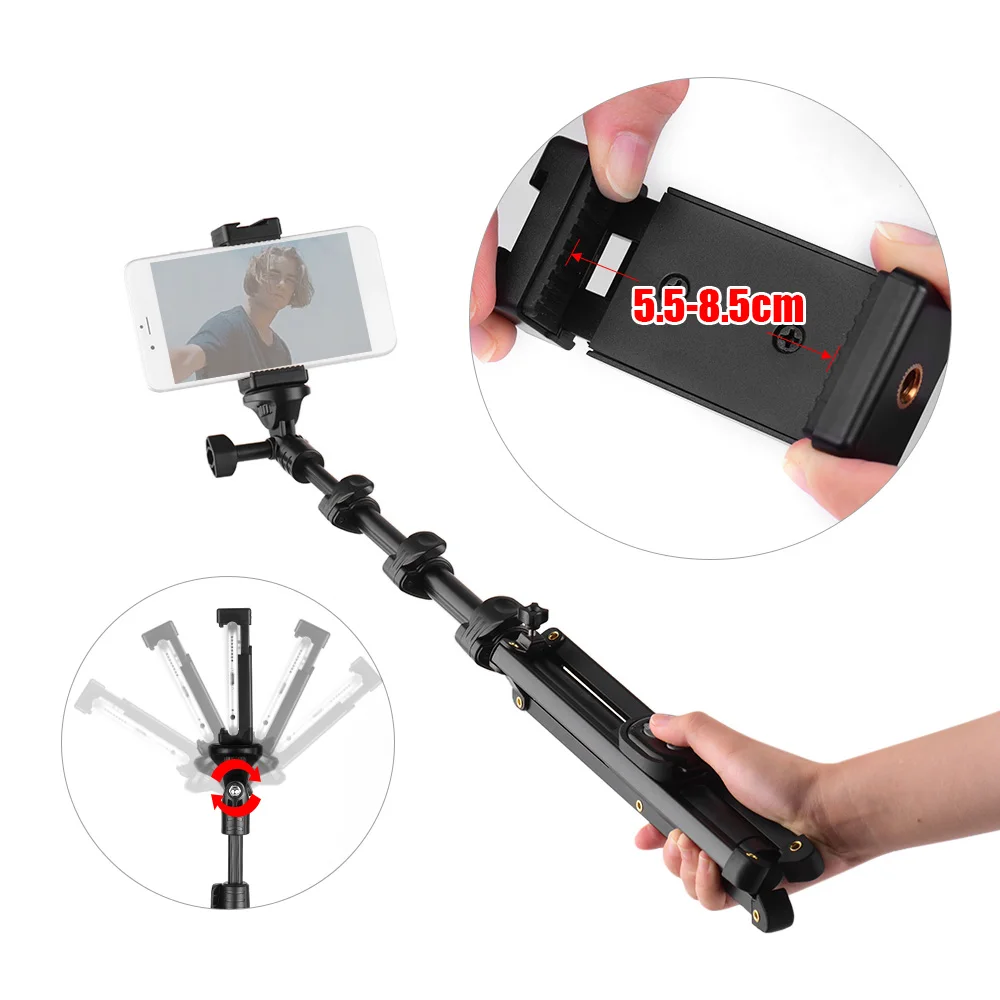 Конструкция «2 в 1: не просто selfie stick, но и штатив для телефона. Удерживайте сложенный штатив как селфи-палку, с минимальной длиной 42 см/16,54 дюйма, и вы можете расширить его как прочный штатив Стенд, чтобы удовлетворить различные случаи жизни.