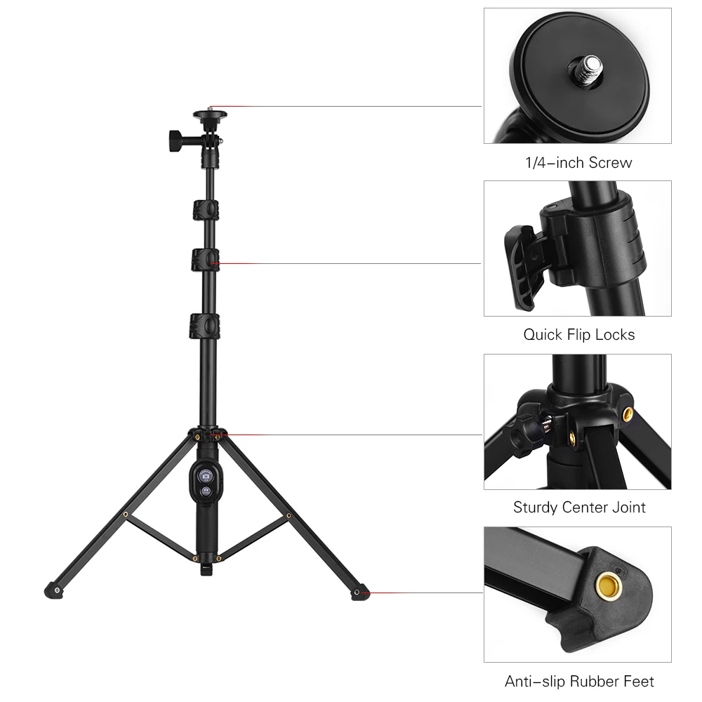Расширяемая рабочая высота: несколько уровней высоты для регулировки с помощью быстрого защелкивания, максимальная высота до 122 см/48 дюймов. Ножки из алюминиевого сплава обеспечивают прочную и прочную поддержку для подшипников телефонов и камер.