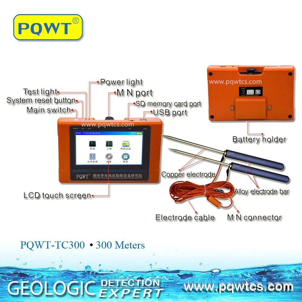 PQWT-TC300 геофизический поиск с помощью одной кнопки подземный детектор воды использовать естественное электрическое поле в качестве рабочего электромагнитного поля источника, на основе различий сопротивления подземных горных пород, руды или грунтовых вод, измерьте естественное электрическое поле на земле N различных частот электрического поля компонента.