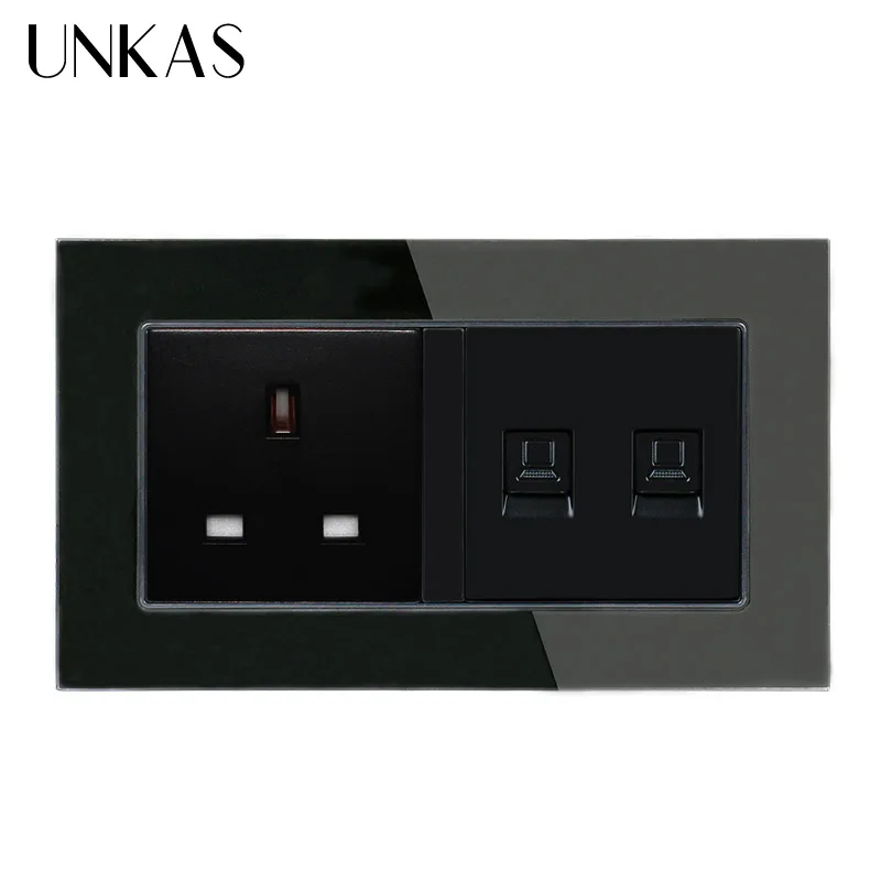 UNKAS белая Роскошная стеклянная панель 2 Gang Wall Power 13A стандарт Великобритании электрическая с двойным RJ45 Интернет-данных компьютера Jack CAT