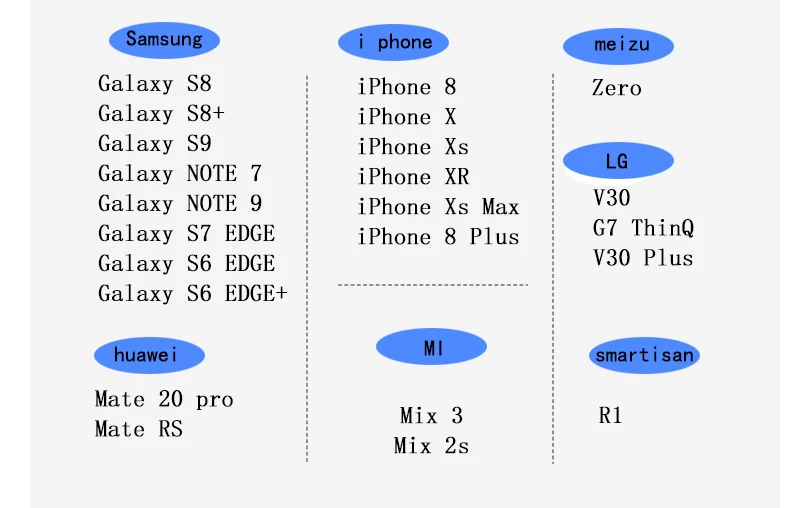 A: все телефоны с размерами от 4,0 до 6,5 дюйма и типа с беспроводной зарядкой доступны для того, чтобы быть ust