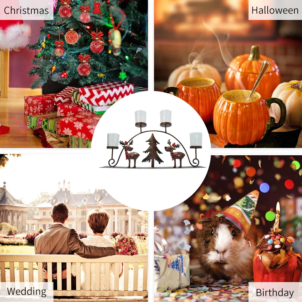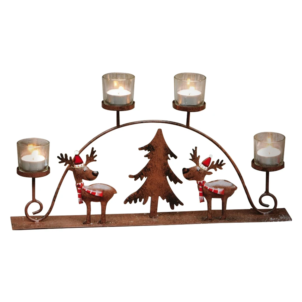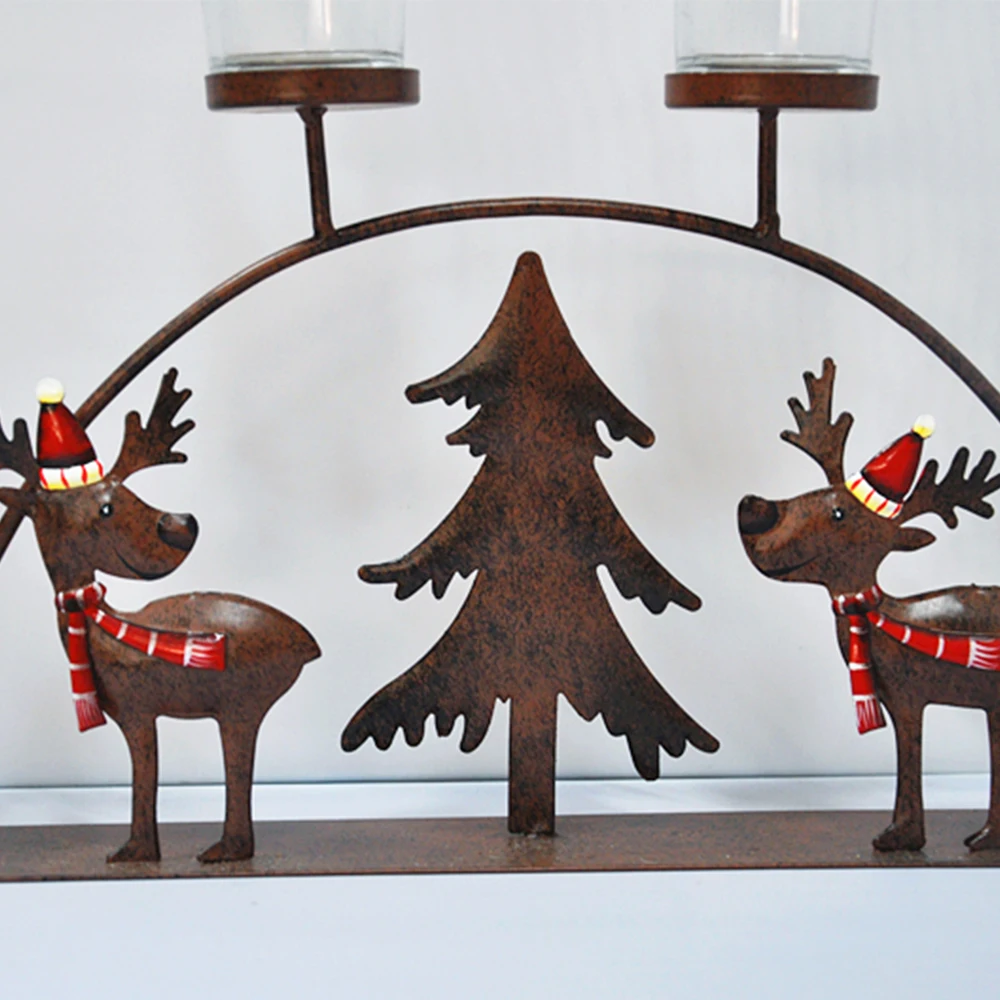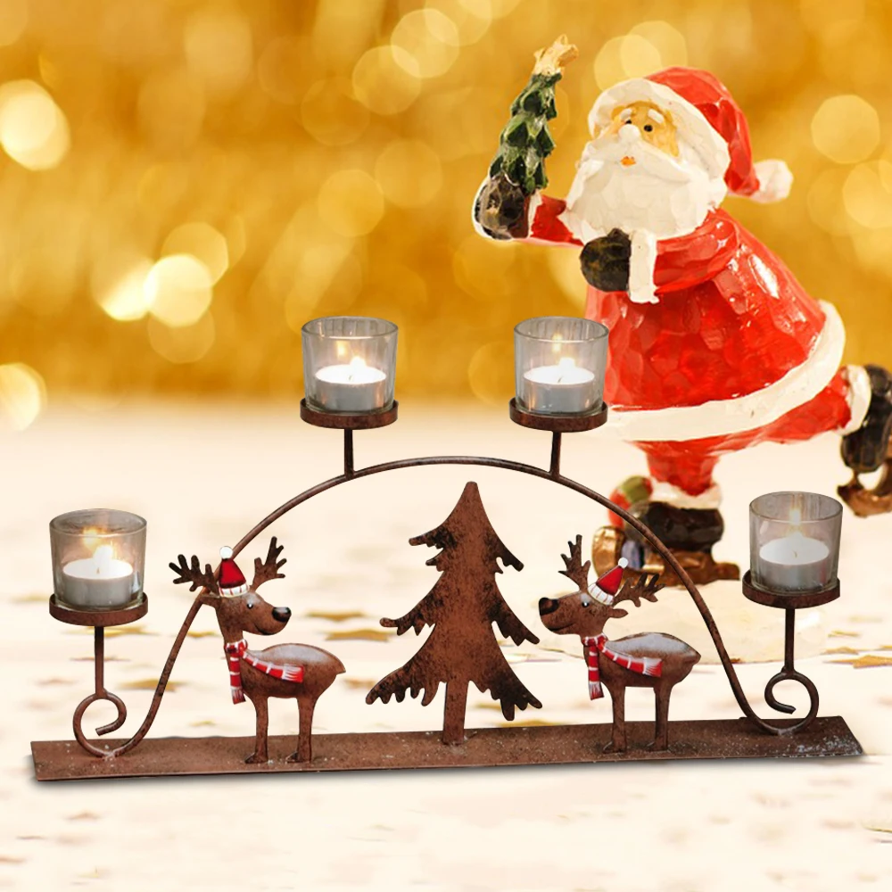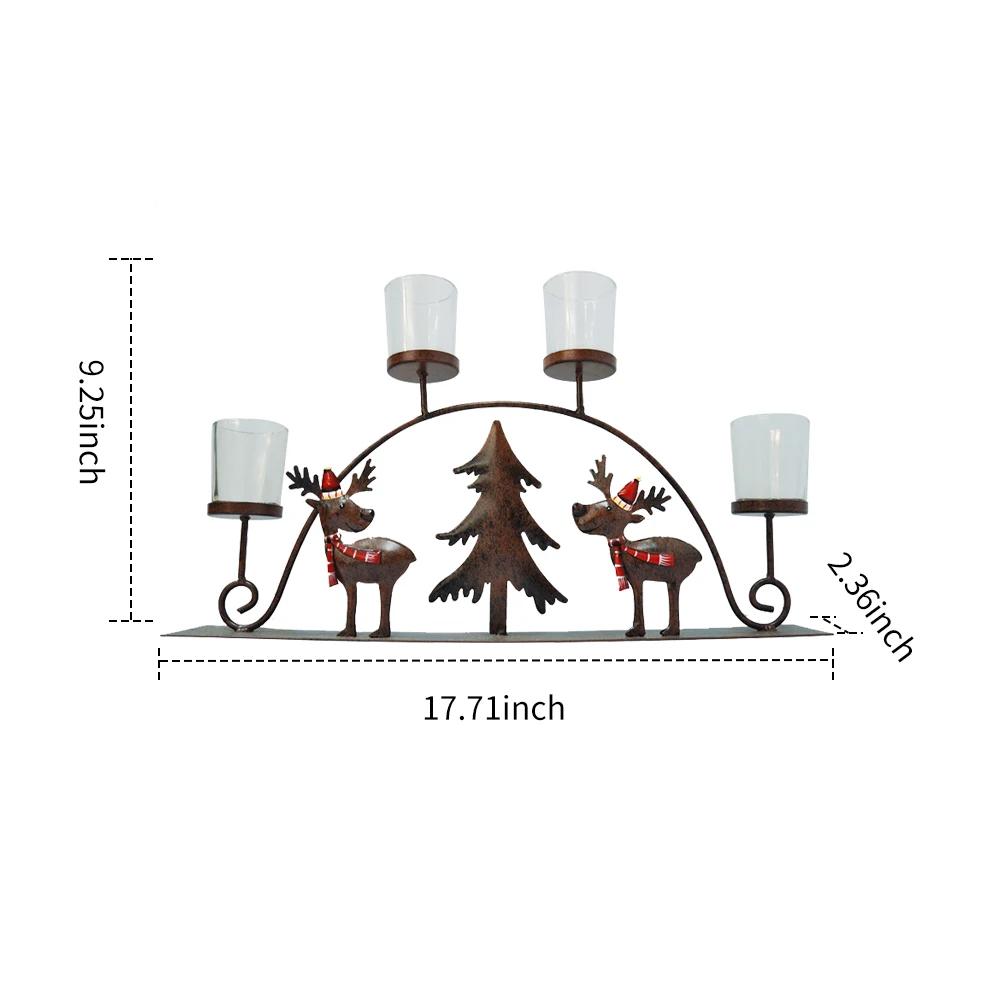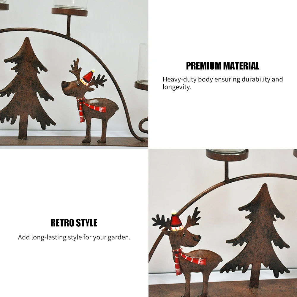 Рождественский подсвечник изготовлен из прочного железа и стекла. Милый и декоративный подсвечник с ретро цветами и нежными деталями, милыми статуями в форме лося и дерева привнесет нежное тепло природы в ваш дом. Подсвечник может быть подарком для ваших друзей и семьи, подходит для свадеб, праздников, дней рождения, Рождества, новоселье и т. Д.