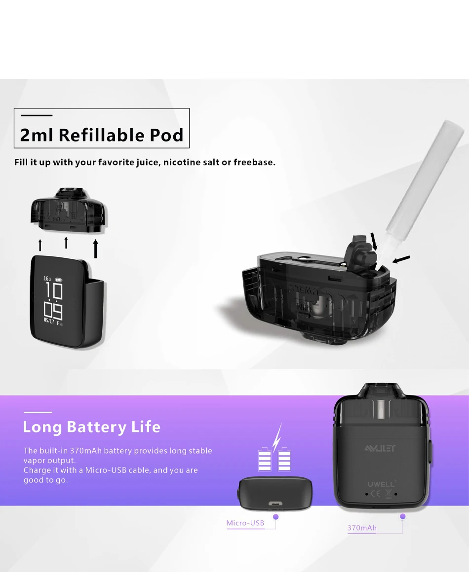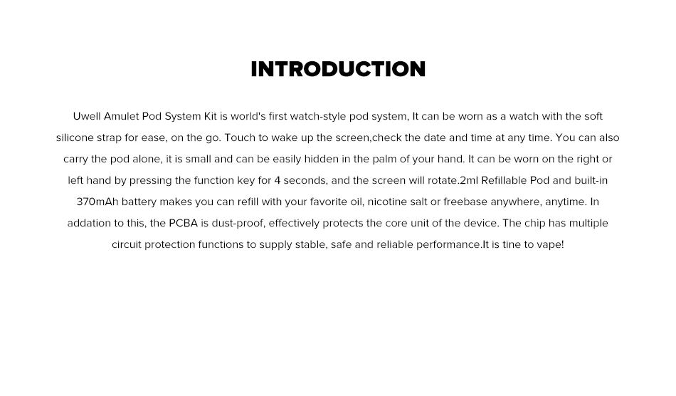 Uwell Amulet Pod System Kit-это первая в мире система для наручных часов, ее можно носить как часы с мягким силиконовым ремешком для удобства, на ходу. Нажмите, чтобы разбудить экран, проверьте дату и время в любое время. Вы также можете носить капсулу отдельно, она маленькая и может быть легко скрыта в ладони. Его можно носить справа или слева, нажимая функциональную клавишу в течение 4 секунд, И экран будет вращаться. 2 мл многоразового использования и встроенный аккумулятор 370 мАч позволяет вам пополнять ваш любимый сок, никотиновую соль или свободную базу в любом месте, в любое время. В дополнение к этому PCBA является пыленепроницаемым, эффективно защищает основной блок устройства. Чип имеет несколько замыканий Функции защиты для обеспечения стабильной, безопасной и надежной производительности. Это tine для vape!