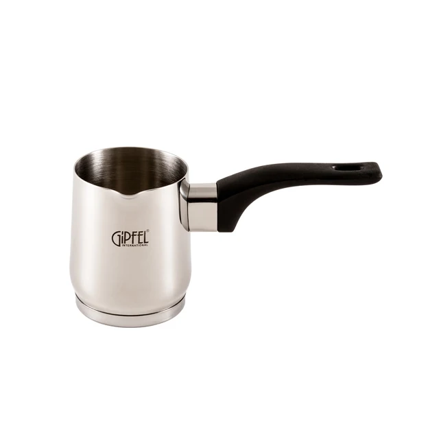 С помощью турки GIPFEL можно быстро приготовить ароматный кофейный напиток. Изделие выполнена из нержавеющей стали марки, которая характеризуется прочностью, износостойкостью, не поддается окислению. Материал не выделяет вредных веществ и безопасен для здоровья человека. Модель также получила прочную ручку из бакелита. Вода в емкости нагревается быстро и равномерно, что сокращает время на приготовление напитка. Посуда пригодна для мытья под проточной водой и в посудомоечной машине.
