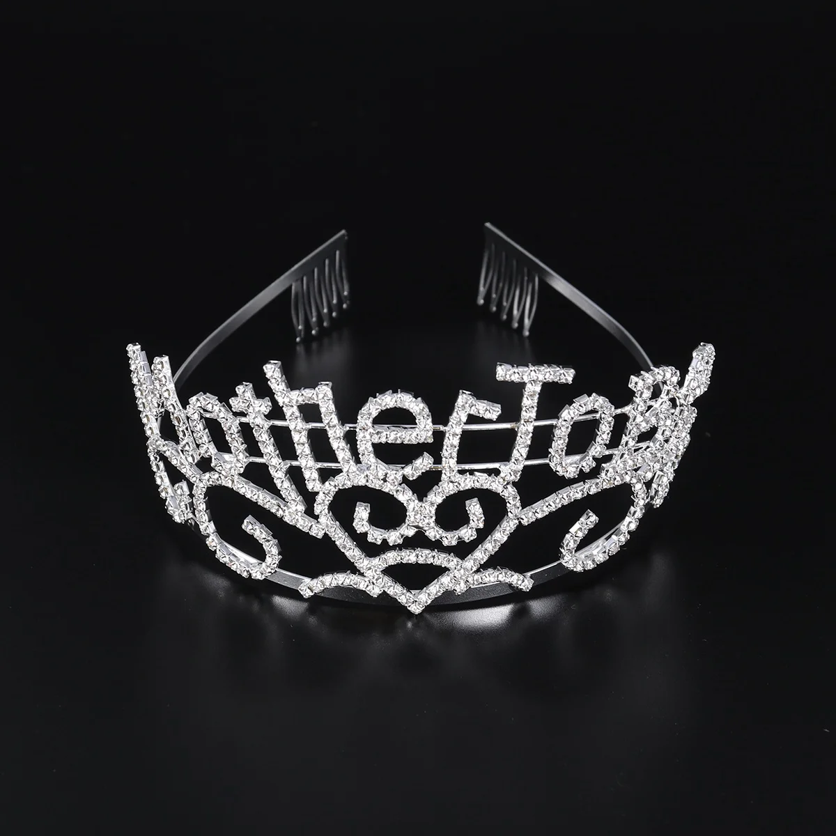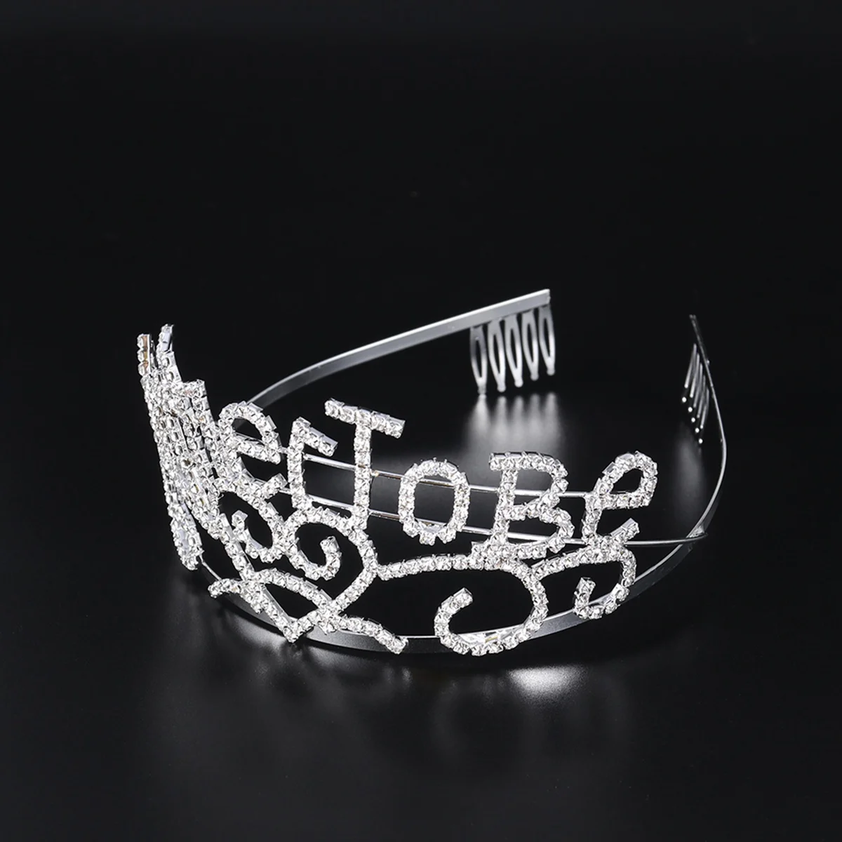 Тиара в стиле повязки на голову имеет небольшие расчески на концах, которые помогают плотно захватывать волосы и фиксируют их на месте. Легкий, но прочный дизайн. Блестящие стразы, украшенные вручную серебристым металлическим узором «mother to be», с узором в виде сердца.