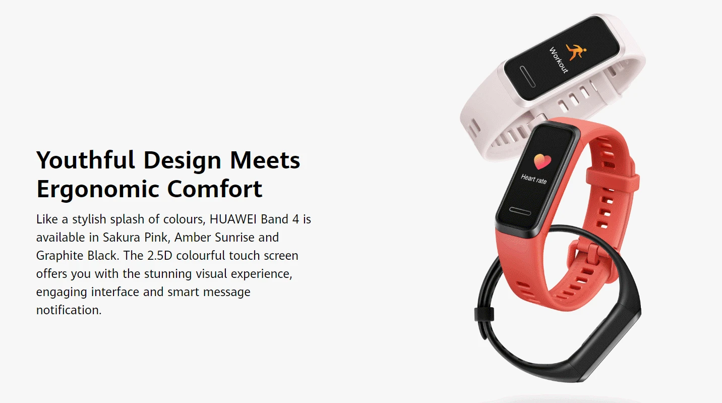Как стильный всплеск цветов, HUAWEI Band 4 доступен в розовом, Янтарном восходе солнца и черном графитовом цвете сакуры. Красочный сенсорный экран 2.5D обеспечивает вам потрясающий визуальный опыт, привлекательный интерфейс и умное уведомление о сообщениях.