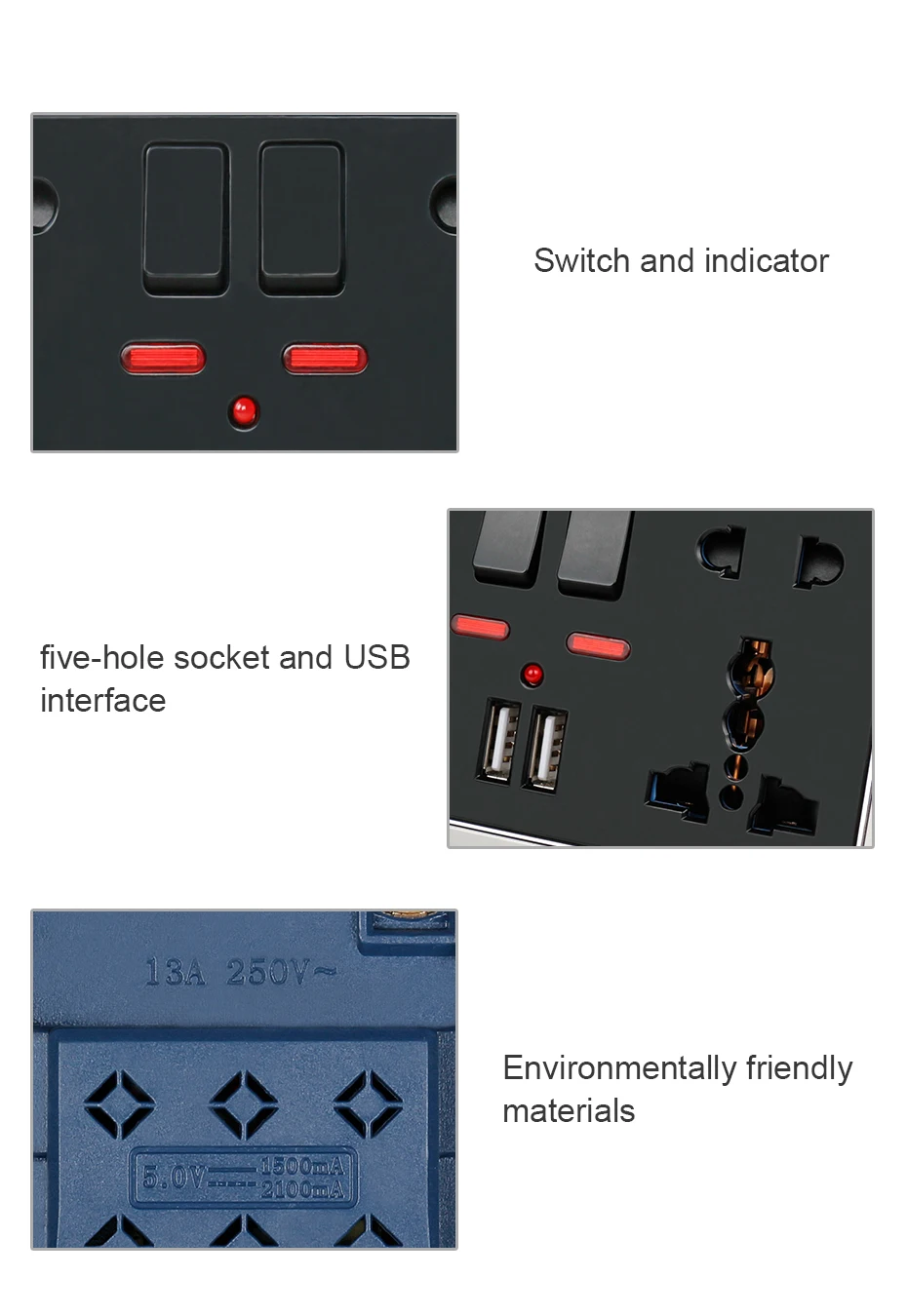 UNKAS двойная универсальная настенная розетка с 5 отверстиями с неоновым 2,1 А двойной usb-порт для зарядки черная розетка из нержавеющей стали