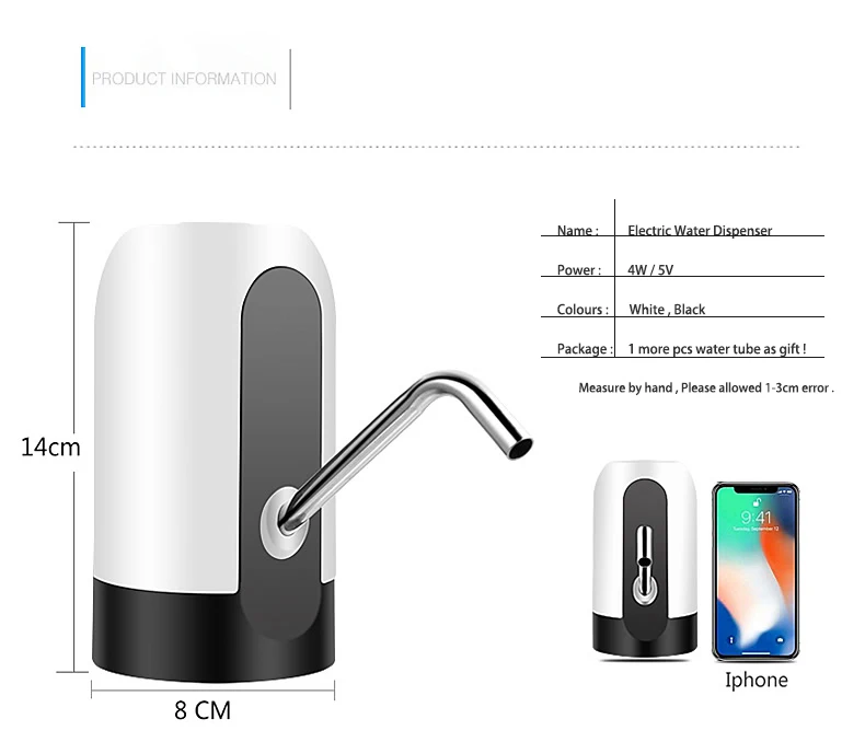 100% новый и высокое качество Лучшая замена для вашего дома-Используйте верхний дозатор нагрузки, он легкий, компактный, простой в эксплуатации. Портативное устройство для использования в помещении и на открытом воздухе, например, для кемпинга, пикника, активного отдыха и т. д. Это очень энергосбережение. Простота установки и использования. Пищевая силиконовая трубка, без запаха, Нетоксичная, здоровая и Экологически чистая, используется с абсолютным доверием. Эта служба всасывания оснащена вилкой питания. Номинальная мощность: 4 Вт Номинальное напряжение: 5 В Номинальная частота: 50 Гц Питание: USB кабель Материал: Пищевая силиконовая водопроводная труба, нержавеющая сталь 304, ABS Размеры: 14x 8 см/5,5x3,1 ''(прибл.) Цвет: черный, белый Количество: 1 комплект 1 главный двигатель 1 х USB кабель 2 x впускная труба 1 х выпускная труба 1 x Руководство пользователя Посылка: 1 комплект + 1 другой сменный шланг (подарок) Примечание: Переход: 1 см = 10 мм = 0,39 дюйма Нет розничной упаковки. Возможны отклонения в 1-3 см вследствие измерений вручную. Пожалуйста, убедитесь, что вы не возражаете, прежде чем сделать ставку. Из-за разницы между различными мониторами изображение может не отражать фактический цвет изделия. Спасибо! Это не может нагревать воду, это дозатор насоса для бутилированной воды