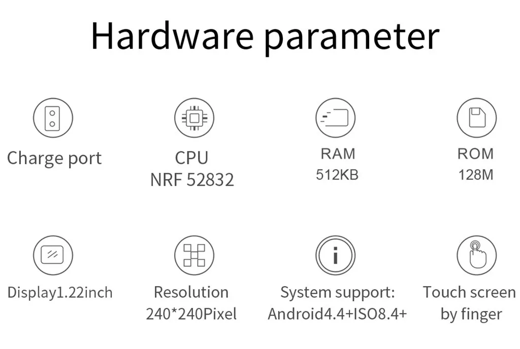 Приложения: Da Fit Процессор: Nordic nRF52832 Системы: Android4.4 +,IOS8.2 + RAM + ROM: RAM 512K + ROM 128M Дисплей: 1,22 дюймов IPS, разрешение 240x240 Экран: сенсорный Экран Bluetooth: BT4.0 ЭКГ: ADS129X Частота сердечных сокращений: 3300 часов Батарея: литиевый аккумулятор 200 мАч Ion polymer battery Порядок зарядки: зарядка Магнитный usb-кабель Спорт: шаги, калории, Расстояние, бег, плавание, Велоспорт, баскетбол, футбол, бадминтон, Для прогулок, альпинизма, Здоровье: пульс, кровь Давление, ЭКГ, ежечасный монитор сердечного ритма, монитор сна, напоминание о малоподвижности, Пить напомнить Напоминания о сообщениях: WhatsApp,Wechat,QQ,LINE,Facebook,Twitter,Linkedln,Skype,Viber и в ближайшее время Другие функции: Поднимите Экран на запястье, напоминания о звонках, напоминания SMS, настройка будильника, поиск Оборудование, фотография встряхиванием, напоминания о встрече, секундомер Водонепроницаемый: IP68 (Плавание выше 1 м около получаса) Время зарядки: 2 ч Время работы в режиме ожидания: 21 день Срок службы: 7 дней Ручной Язык экранного меню Упрощенный китайский, английский, русский, французский, немецкий, португальский, испанский, Японский Языков для app : Упрощенный китайский, английский, русский, французский, немецкий, португальский, испанский, Японский, итальянский, малайский, корейский, польский Языков для часов Упрощенный китайский, английский, русский, французский, немецкий, португальский, испанский, Японский, итальянский, малайский, корейский, польский Материал часы корпус: ABS + PC ремешок: сталь/кожа/ТПУПримечание: