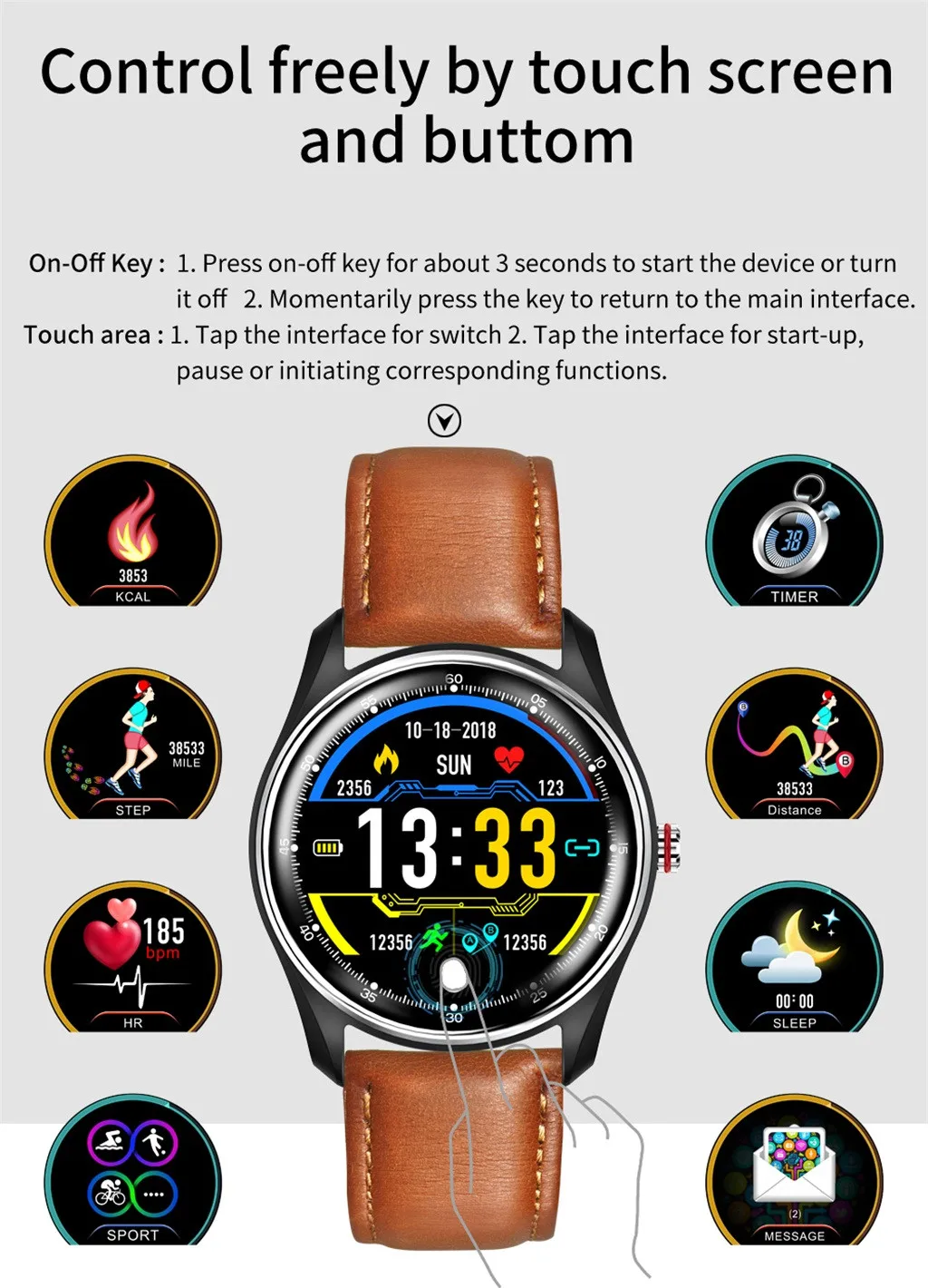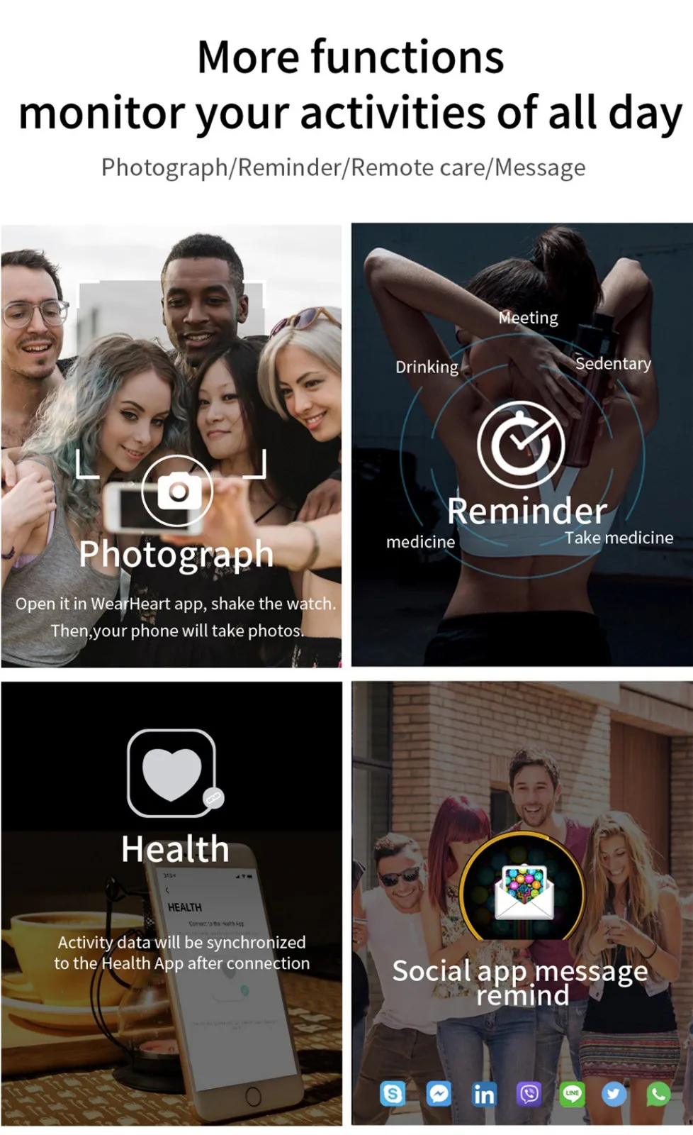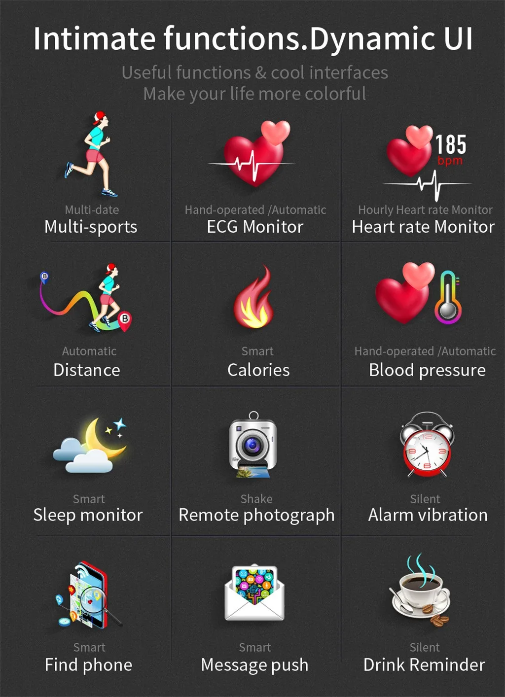 1. Мульти-Спорт: Переключиться в спортивном режиме Интерфейс. Нажмите кнопку для входа в режим мульти-спорта, затем нажмите и удерживайте Время сохранения начинается, долго давит снова и время держать pausesm короткое нажатие Для выхода и выхода в следующий спортивный режим. Восемь спортивных режимов В настоящее время: бег, прогулки, езда на велосипеде, баскетбол, футбол, бадминтон, альпинизм, плавание. 2. Монитор артериального давления: После перехода на эту Интерфейс, нажмите вибрацию, чтобы начать тест кровяного давления. Вибрация Снова указывает конец измерения и данные измерения будут Отображается снова указывает конец измерения и измерение Данные будут Отображается. Вы также можете Начните измерение артериального давления в приложении. 3. Монитор сердечного ритма: После перехода на эту Интерфейс, нажмите вибрацию, чтобы начать тест скорости. Вибрирует снова Показывает конец измерения и данные измерений будут Отображается снова указывает конец измерения и измерение Данные будут Отображается. Вы также можете Начните Измерение частоты сердечных сокращений в приложении 4. ECG и PPG: 24-часовой непрерывный Мониторинг и анализ кровотока под кожей через зеленый светильник Светодиодный светильник с датчиком, частота сердечных сокращений отображается в режиме реального времени с помощью Фото-электрический метод отслеживания импульсных волн. 5. Режим сна: Он может отображать Данные об общей продолжительности вашего сна прошлой ночью. Продолжительность мониторинга составляет 22:00 дня от 1 до 08:00 дня 2. Соответствующие спальные данные будут Отображается после 08:00. Примечание: мониторинг данных сна в течение и периода За исключением выше Продолжительность не будет Зафиксировано. 6. Для пульта дистанционного управления Поддержка сигнализации, напитков Вода, сидячие, звонки, SMS (сообщения, QQ, Wechat, Skype, Facebook, Twitter, Line, Whatsapp), анти-потеря напоминания. Часы будут напоминать вам С вибрацией. 7. Другие функции: Время, удаленная камера, найти Браслет, шагомер, вибрационное напоминание, защита от потери, расчет расстояния , Будильник. Секундомер. 8. Язык приложения: Китайский и английский языки, Японский, испанский, немецкий, французский, русский, португальский.Вопросы и ответы: