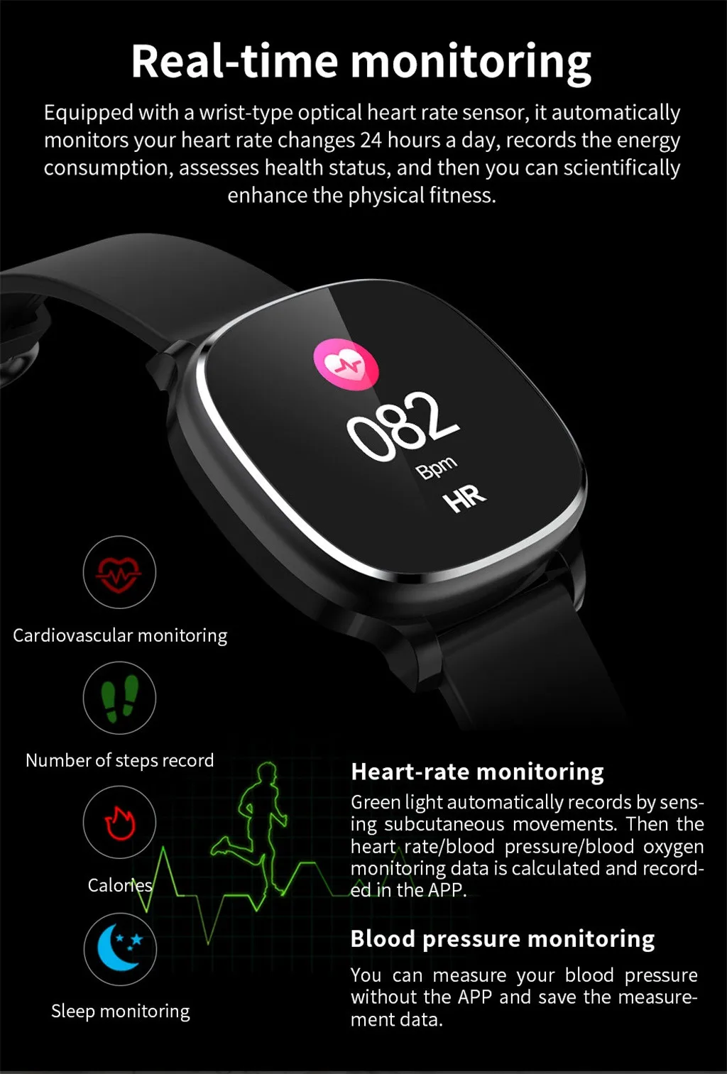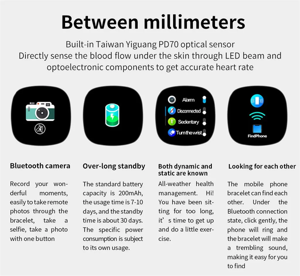 1. Самая Точная кровь Монитор давления. 2. Самое точное сердце Контролируйте и напоминайте. 3. Шагомер и бег Режим 4. Монитор сна на основе Алгоритм сердечного ритма. 5. Обнаружение аритмии И напоминаем. 6. Сигнализация с вибрацией. 7. Расчет расстояния. 8. Калории. 9. Оповещение о звонках и SMS С нажатием сообщения (может отображать номер телефона и содержимое SMS). 10. Экран 0,95 дюйма. 11. RTC (12/24 ч) 12. Обновление OTA. 13. Класс водонепроницаемости IP67 14. Время работы: 15 днейПараметр внешнего вида