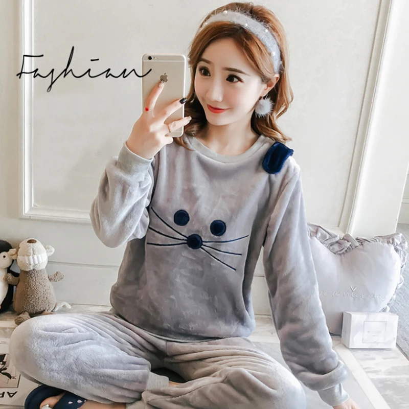 Осенне-зимние женские пижамы, серые милые пижамы с изображением мышки, маленькие свежие пижамы, костюм с длинными рукавами, женская теплая Повседневная Домашняя одежда