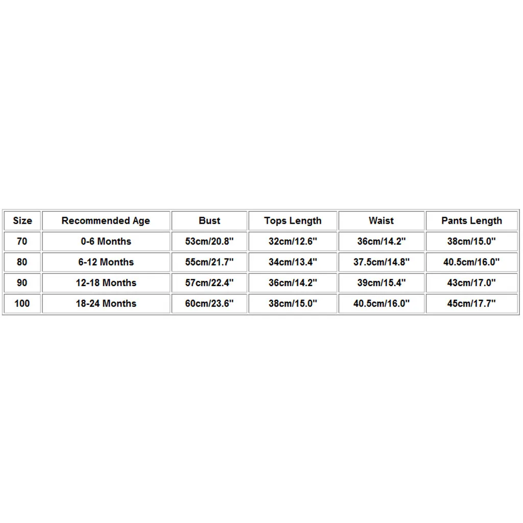 SizeRecommended AgeBustTops LengthWaistPants Length700-6 Months53cm/20.8"32cm/12.6"36cm/14.2"38cm/15.0"806-12 Months55cm/21.7"34cm/13.4"37.5cm/14.8"40.5cm/16.0"9012-18 Months57cm/22.4"36cm/14.2"39cm/15.4"43cm/17.0"10018-24 Months60cm/23.6"38cm/15.0"40.5cm/16.0"45cm/17.7"