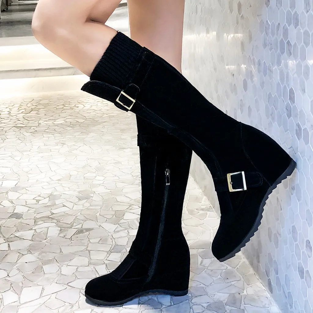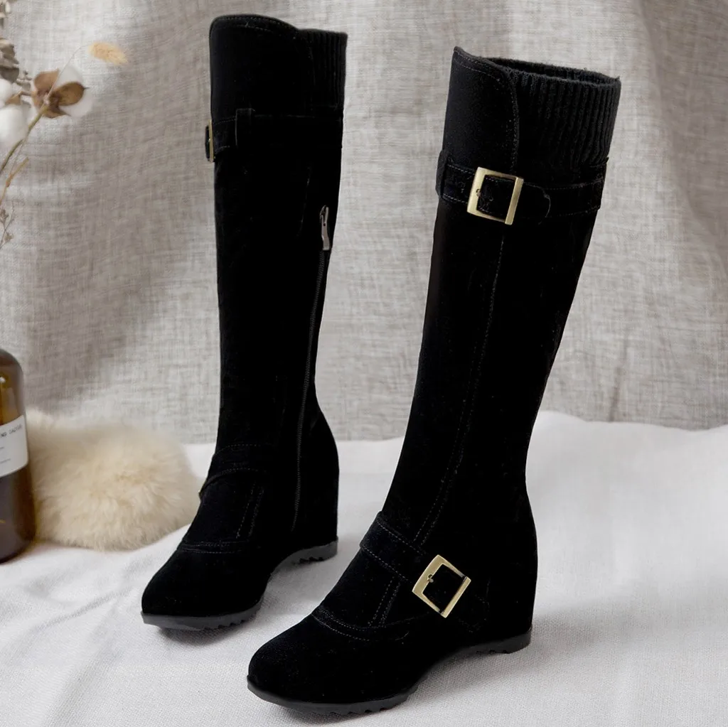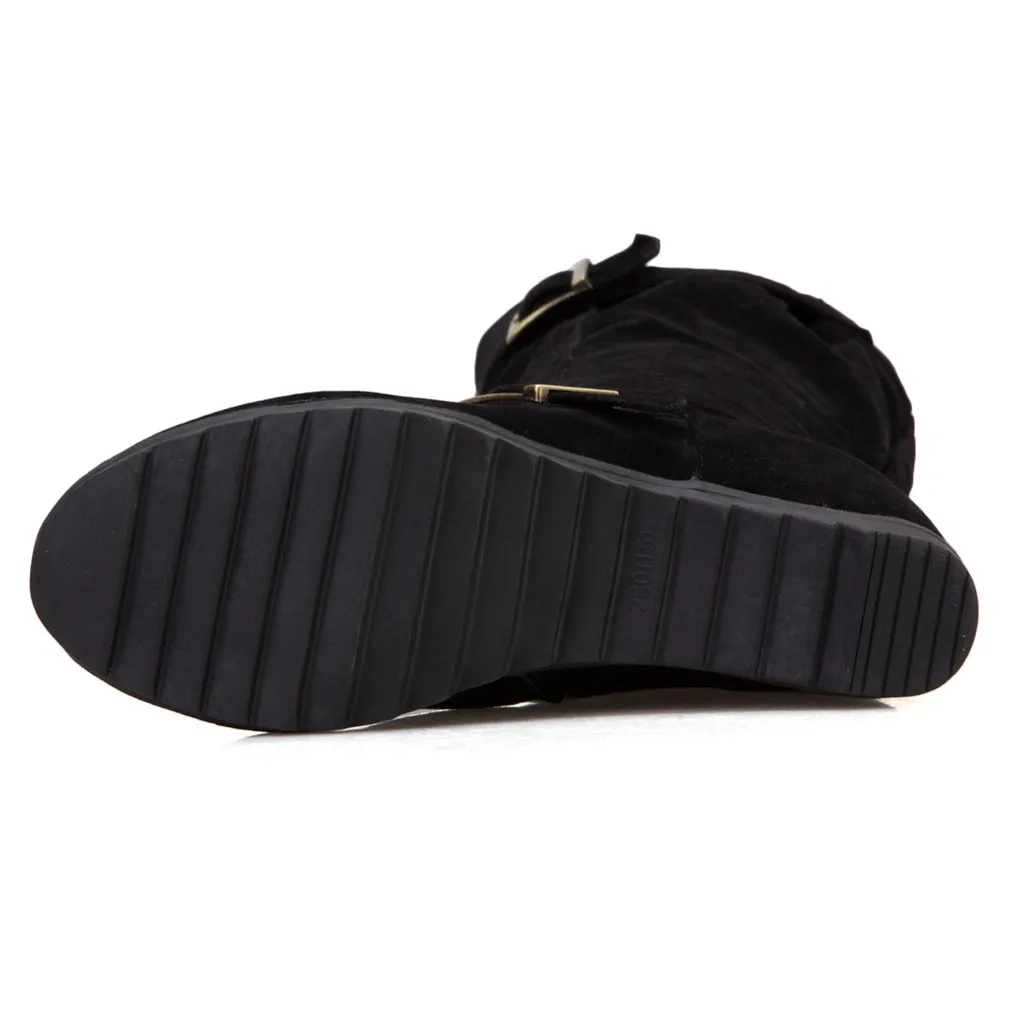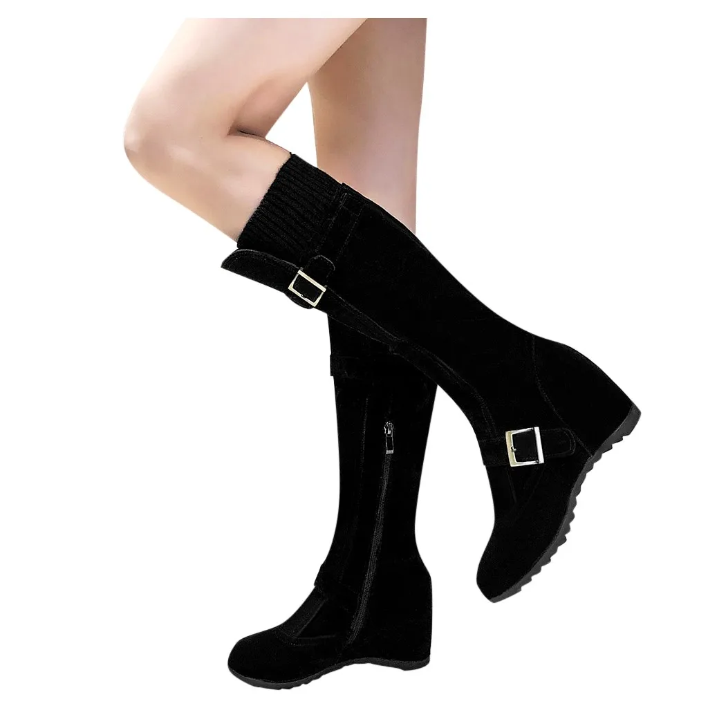 Women's Side Zip Buckle Knee High Boots Wedges Shoes Casual Middle Tube Booties