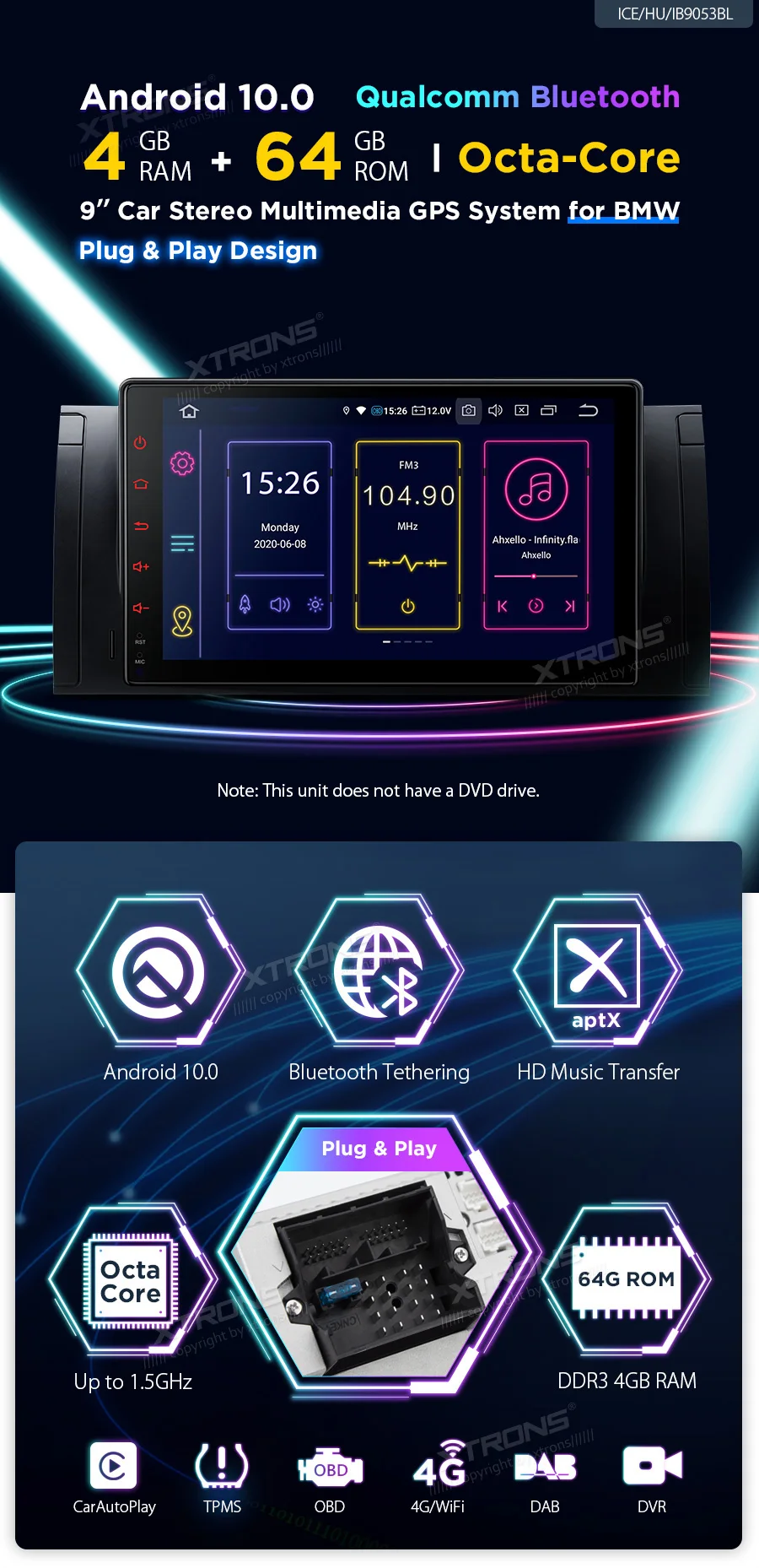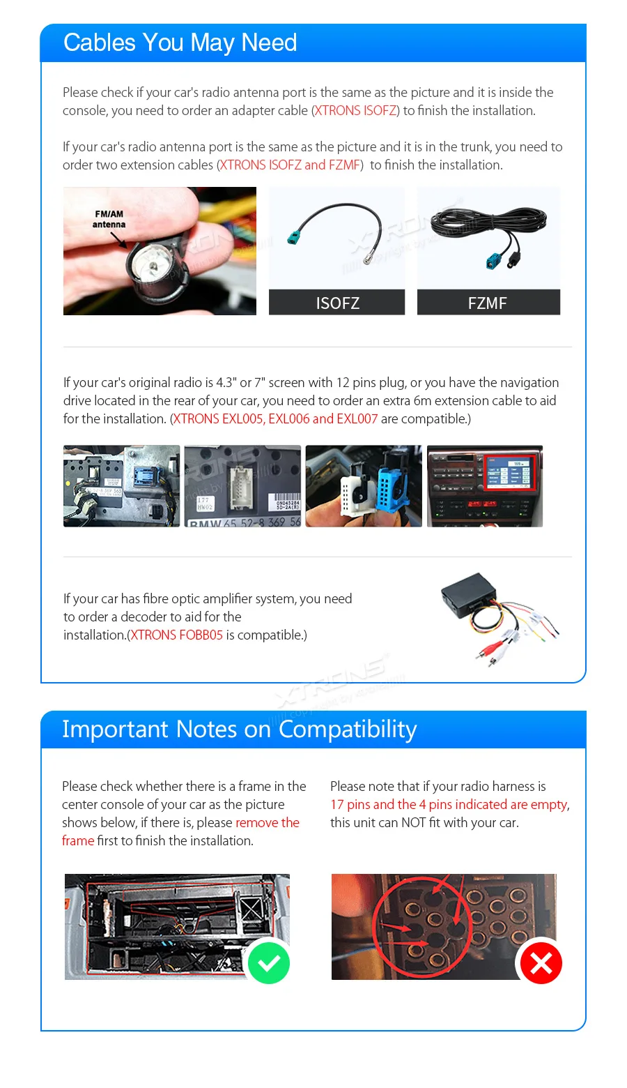 Подходящие моделиДля BMW X5 E53 (1999-2006), BMW 7 серии E38 (1994-2001)Примечание: у этого устройства нет DVD.Лицевая панель: 286x128ммХотя мы приложили все усилия, чтобы убедиться, что данное устройство будет совместимо с указанными транспортными средствами, пожалуйста, проверьте год, размеры и форму центральной консоли ваших транспортных средств перед покупкой.Кабели, которые могут вам понадобиться:1. Пожалуйста, проверьте, является ли порт радиоантенны вашего автомобиля таким же, как на картинке, и он находится внутри консоли, если это так, вам нужно заказать адаптер радиоантенны для завершения установки. (XTRONS ICE/ACS/ISOFZ совместимы.)2. Пожалуйста, проверьте, находится ли порт радиоантенны вашего автомобиля в багажнике автомобиля, если это так, вам нужно заказать Удлинительный кабель радиоантенны для завершения установки. (XTRONS ICE/ACS/FZMF и ICE/ACS/ISOFZ совместимы)3. Если ваше Авто оригинальное радио-4,3 "или 7" экран с 12 контактов штекером, или вы имеете навигационный накопитель, расположенный в задней части вашего автомобиля, вам необходимо заказать дополнительный Удлинительный кабель 6 м, чтобы помочь в установке. (XTRONS EXL005, EXL006 и EXL007 совместимы).4. Если у вашего автомобиля есть волоконно-оптический усилитель, такой как "Harman Kardon'', вам нужно заказать декодер, чтобы помочь установке. (XTRONS fob05 совместим).Важные Примечания о совместимости1. Пожалуйста, проверьте, есть ли рамка в центральной консоли вашего автомобиля, если есть, пожалуйста, сначала снимите рамку, чтобы закончить установку.2. Пожалуйста, обратите внимание, что если ваш радиоприемник имеет 17 контактов и 4 указанных контакта пусты, этот блок не подойдет вашему автомобилю.