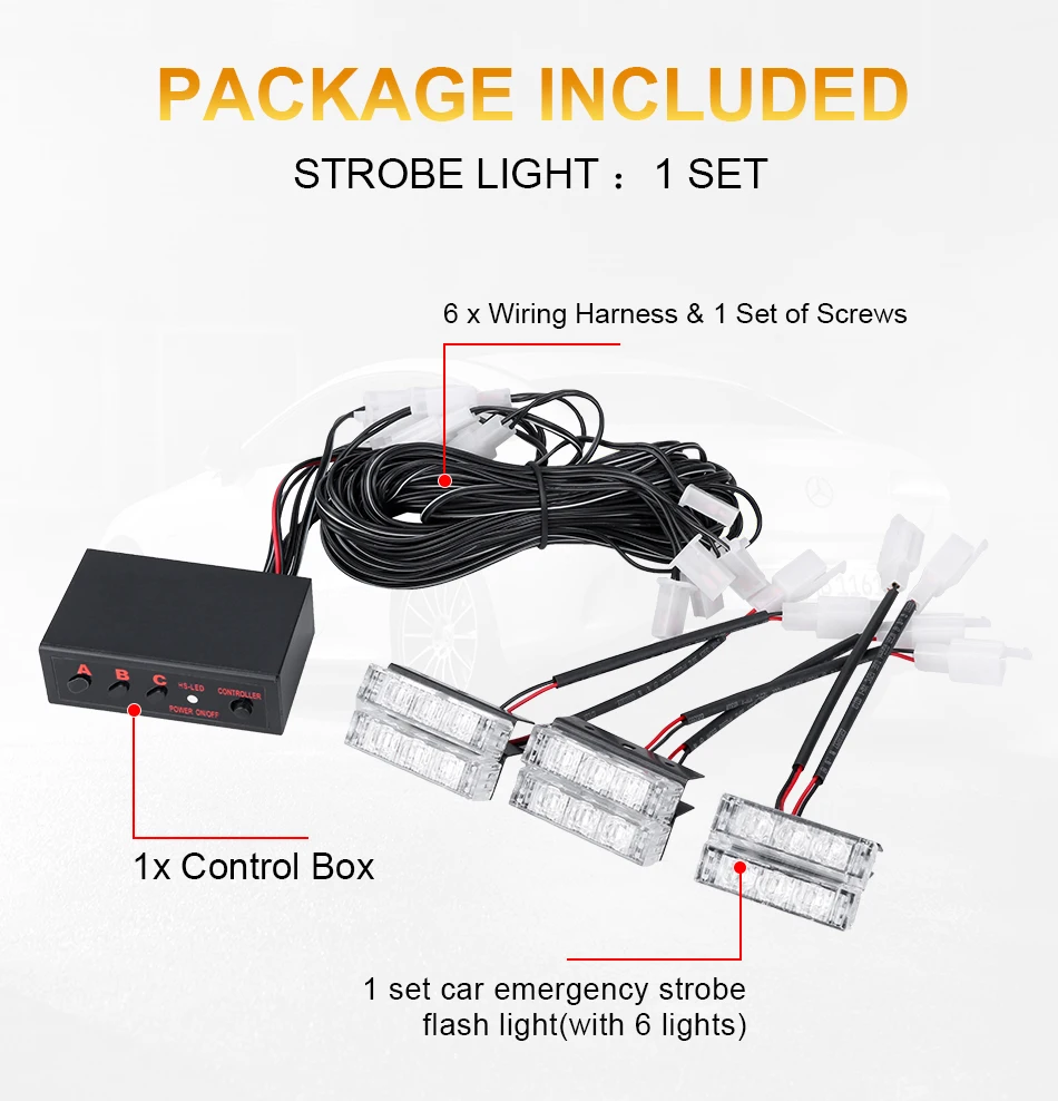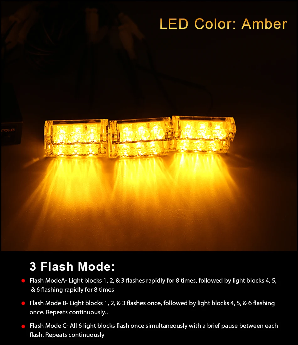 ★ 100% Brand New and High Quality strobe emergency flash light!!! • The Latest High Quality LED Chip-Set Technology. • Fitment: Universal fit all Cars SUV vans and trucks with DC 12V. • DIY Installation. Adjustable angle to fit different screens. Each individual strobe light has 3 superbright LED’s and fixing brackets to ensure an easy installation. •It is in the design of compact which makes it small and only takes a small space. • Waterproof, Anti-collision, anti-dust and splash-proof---Low consumption. Energy Saving; Long lifespan. •Great upgrade for hazard light system; Recovery vehicles, Trucks, Breakdown Vehicles, etc. Specification: Voltage: DC 12V Output Power: 3W LED Color: Amber 6 x LED Grill Lights (3 LEDs per light) Flashing modes: 3 Light Dimensions: 48*15*12mm Control Box Dimensions: 76*48*25mm Packing Dimension: 19*13.5*7cm Lifespan: Up to 30000 hour life expectancy 3 Flash Mode: Flash ModeA- Light blocks 1, 2, & 3 flashes rapidly for 8 times, followed by light blocks 4, 5, & 6 flashing rapidly for 8 times. Flash Mode B- Light blocks 1, 2, & 3 flashes once, followed by light blocks 4, 5, & 6 flashing once. Repeats continuously.. Flash Mode C- All 6 light blocks flash once simultaneously with a brief pause between each flash. Repeats continuously. NOTE: Due to the different display and different light, the picture may not reflect the actual color of the item. Thanks for your understanding. Package Included: 1 set car emergency strobe flash light(with 6 lights) 1x Control Box 6 x Wiring Harness