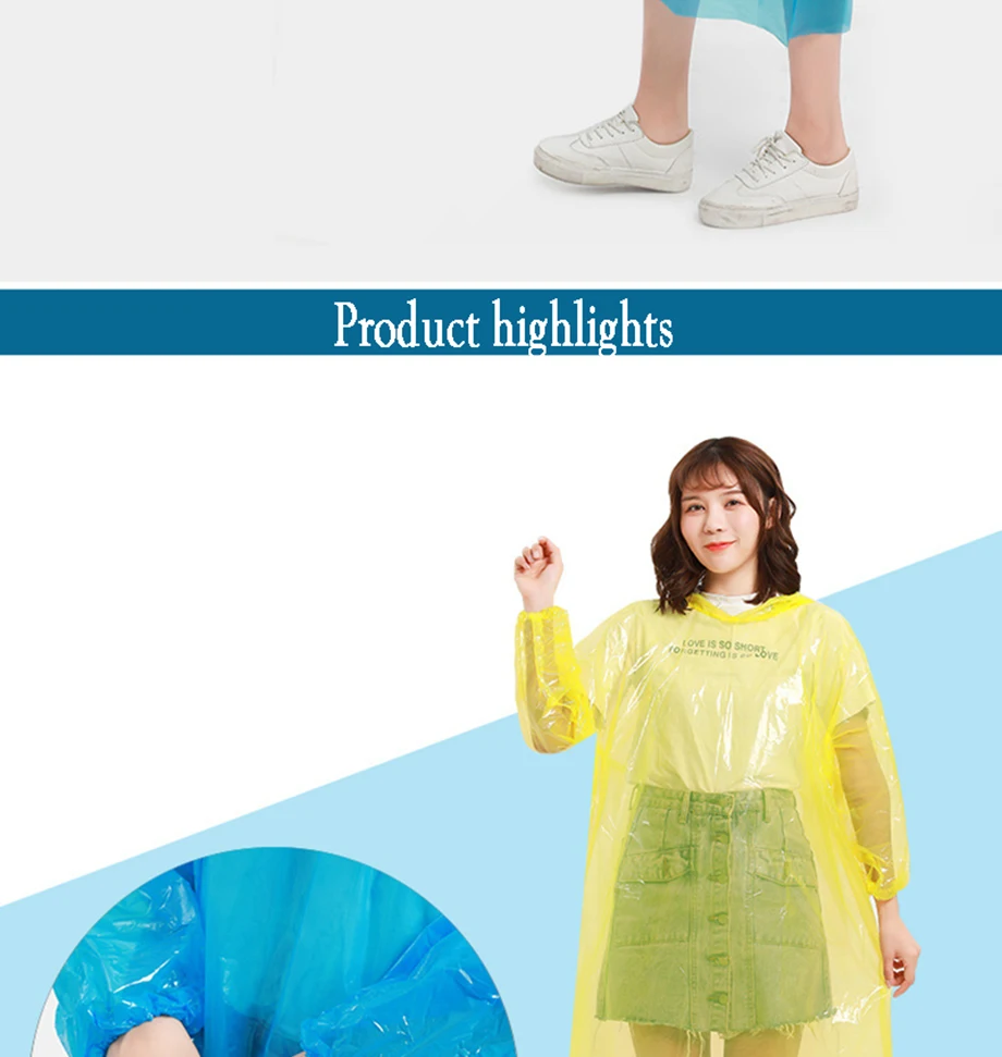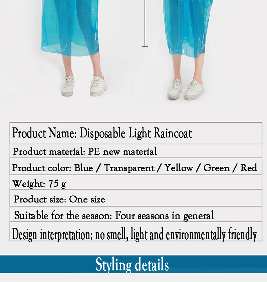 Название продукта: одноразовый светлый плащ Материал изделия: PE новый материал Цвет изделия: синий/прозрачный/желтый/зеленый/красный Вес: 75 г Размер изделия: один размер Подходит для сезона: четыре сезона в целом Интерпретация дизайна: без запаха, светильник, экологически чистый Размер: один код Рекомендуемая высота: 148-200 см Рекомендуемый вес: 45-100 кг