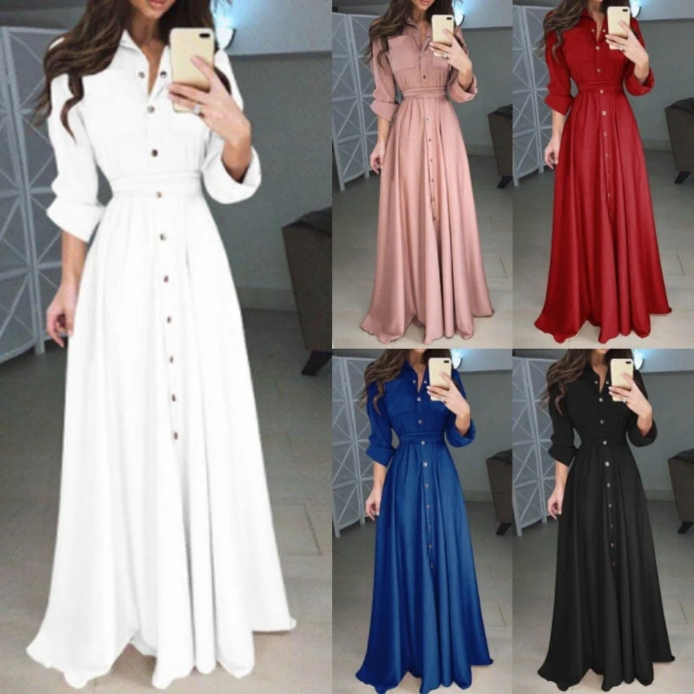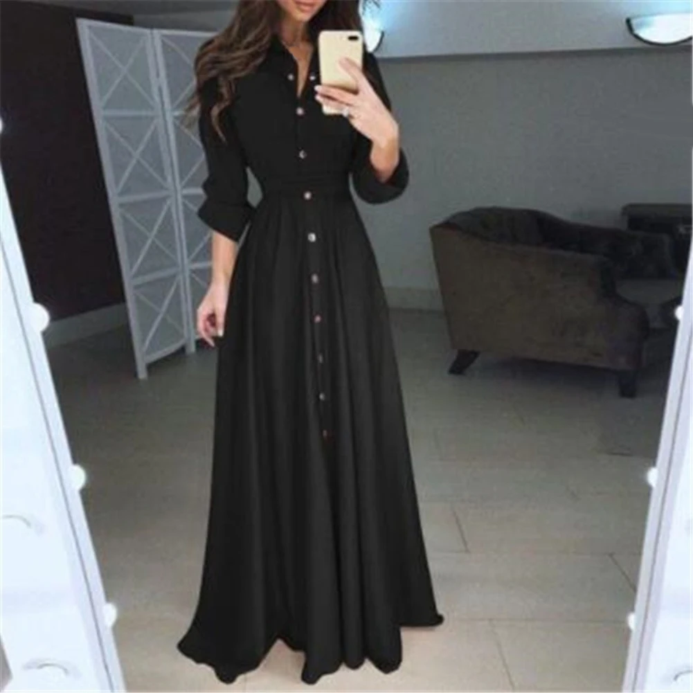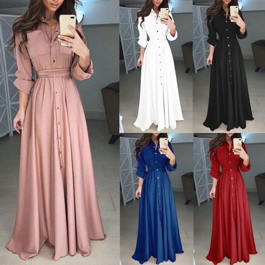 Женское однобортное платье макси на пуговицах, с длинным рукавом и отложным воротником, для танцевальной вечеринки