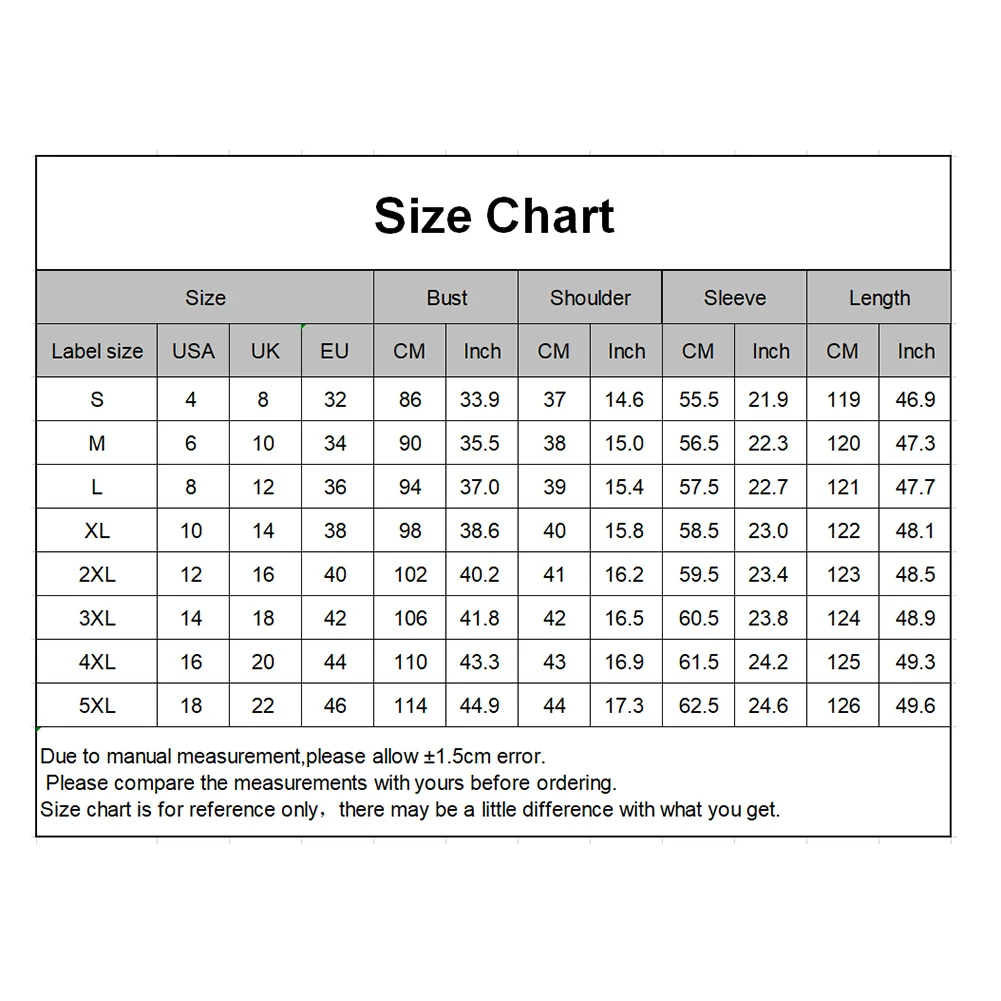 [Наш Размер XXXL] Обхват груди: 106 см/41,73 дюйма, ширина плеч: 42 см/16,54 дюйма, длина рукава: 60,5 см/23,82 дюйма, длина: 124 см/48,82 дюйма (прибл.)