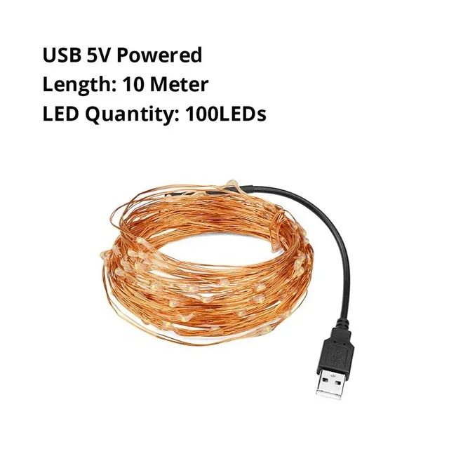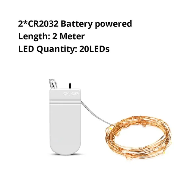 * Материал: медная проволока * Цвет света: белый/теплый белый/сменный. * Напряжение: 3 х АА сухая батарея/USB питание/2 х CR2032 батарея * Количество светодиодов: 20 светодиодов/50 светодиодов/100 светодиодов