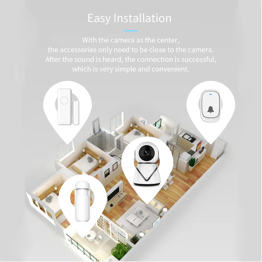 -Легко Установка С камерой в качестве центра, аксессуары должны быть только близко к камере. После того, как звук услышан, соединение успешно, что очень просто и удобно. -Камера ночного видения HD 1080P пикселей высокой четкости, ночное видение также очень ясно, с дверным звонком/инфракрасным датчиком/дверным магнитом, что делает дом умнее и безопаснее Плакать сигнализации Децибел будильника может быть установлен сам по себе, даже если он не находится на стороне ребенка, мобильный телефон может немедленно нажать на информацию. -Удаленное Управление Можно дистанционно управлять, используя мобильный телефон, с возможностью воспроизведения эксклюзивной музыки для домашних животных -Четырехъядерный обзор Приложение может подключать несколько камер, может поддерживать 4 экрана камеры одновременно, нет необходимости резать экран, очень удобно -Умный дверной Звонок Умный дверной звонок и камера могут использоваться вместе. Когда кто-то нажимает на дверной звонок, камера может издавать звук, чтобы напомнить семье -Инфракрасный датчик тепла Расстояние срабатывания составляет 12 метров, а диапазон-110 °. Когда кто-то проходит диапазон чувствительности, камера может звуковой сигнал