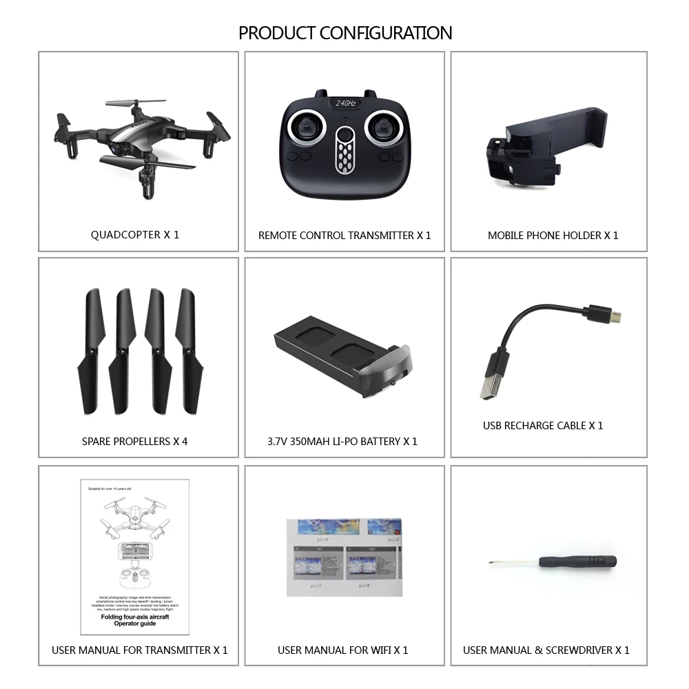 Упаковочный лист: 1 * летательного аппарата 1 * пульт дистанционного управления 4 * защитная рамка 4 * Пропеллер 4 * ветровой колпак 1 * Usb кабель для зарядки 1 * отвертка 1 * Инструкция по эксплуатации Обратите внимание: 1. Из-за разницы между различными мониторами изображение может не отражать фактический товар, пожалуйста, учитывайте это перед покупкой. 2. Возможны отклонения на 1-3 см вследствие измерений вручную. Спасибо за понимание.
