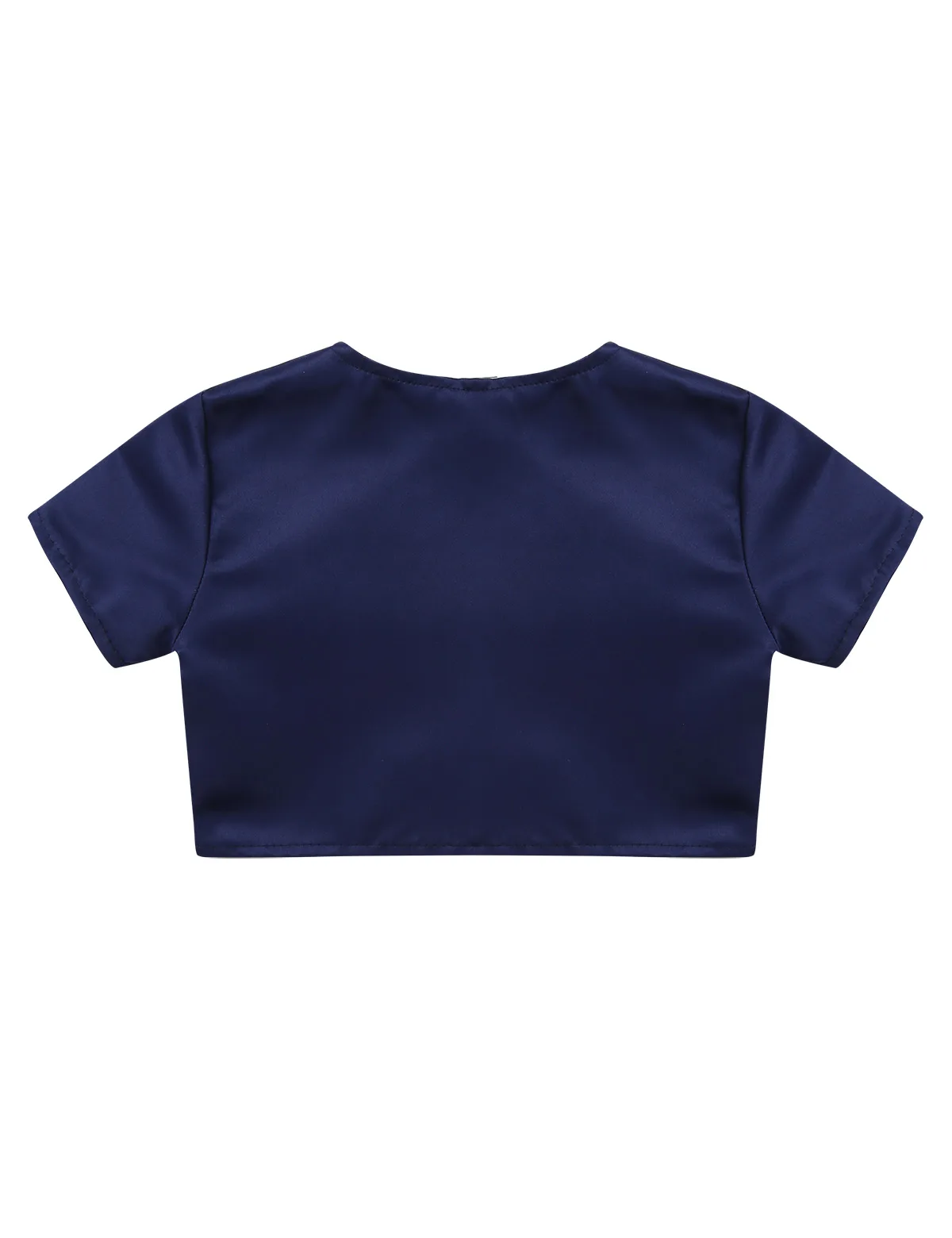 Короткие рукава, круглый вырез. Открытый дизайн спереди. Длина выше талии и с подкладкой.