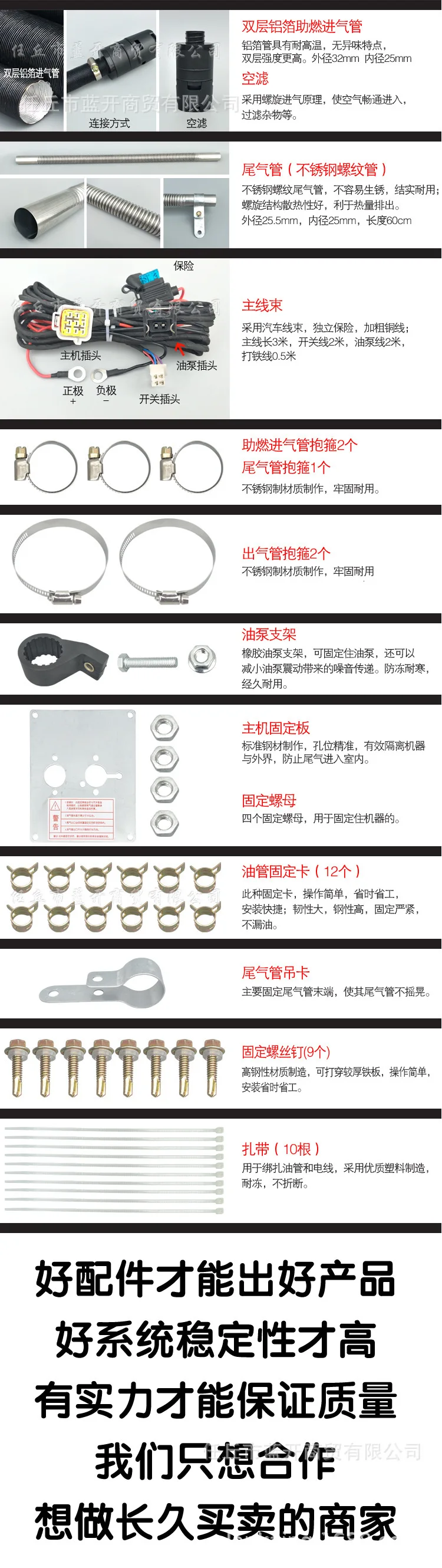 Компания в основном производит 5000 Вт 2000 Вт парковочный воздушный обогреватель для удовлетворения потребностей клиентов, особенно английская версия парковочного обогревателя (также доступна).