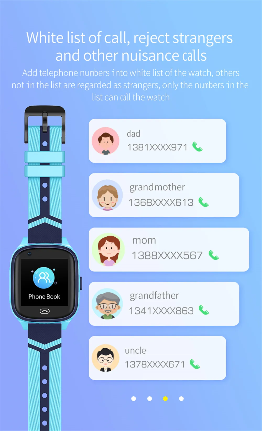 Телефонная книга, функция микрочата, двусторонний вызов, микрочат, удаленный мониторинг, настройка частоты поиска звезды, электронный забор, настройка ребенка, напоминание о сообщениях, несколько сложений ребенка, Запрос истории трека, функция воспроизведения истории трека, Wi-Fi позиционирование + gps позиционирование + базовая станция помощь позиционирования, мониторинг заряда батареи, сеть автоматически для синхронизации часов