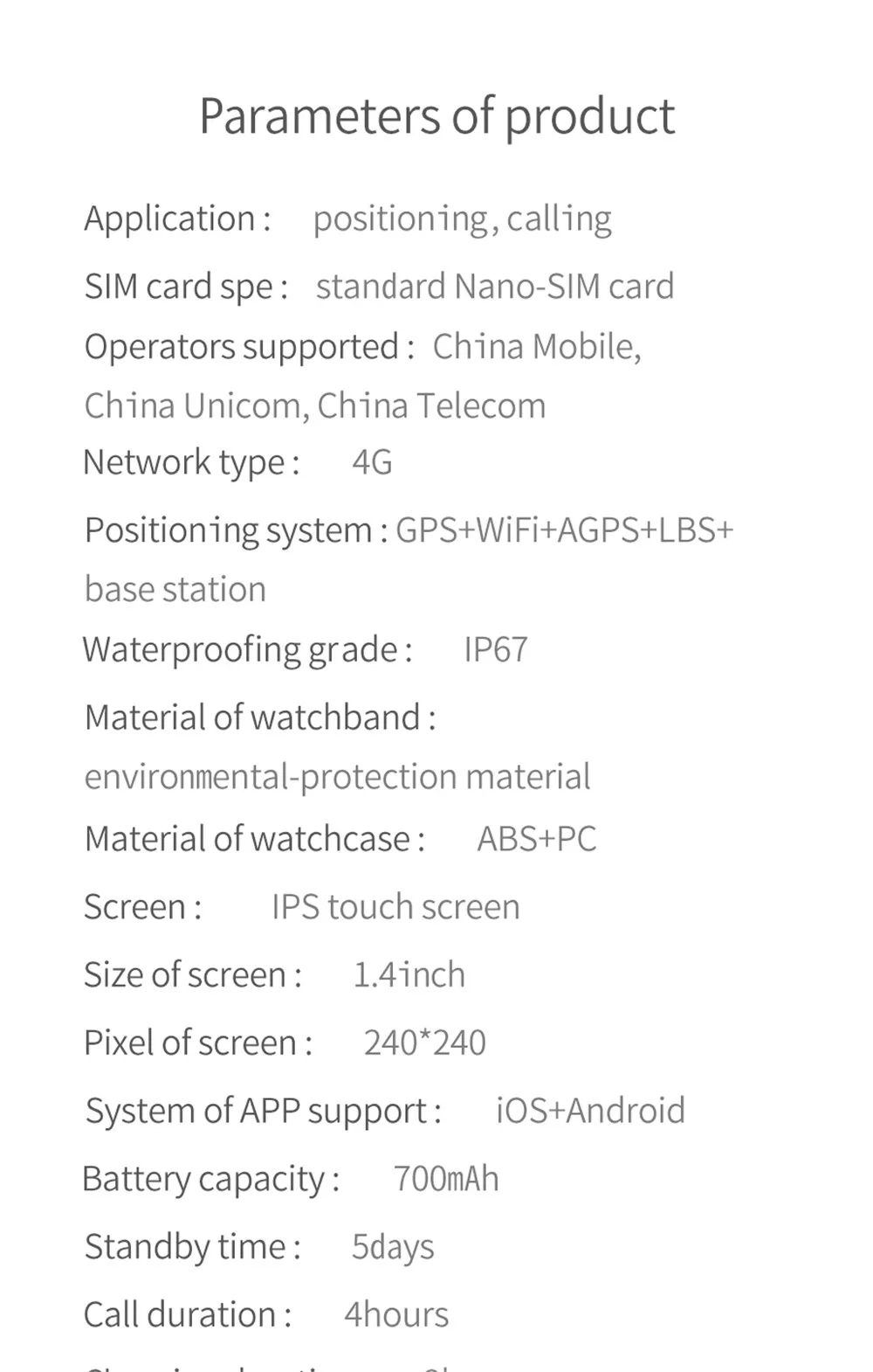 Водонепроницаемый Рейтинг: IP67 Емкость аккумулятора: 700 мАч Время работы в режиме ожидания: 1-3 дня Время работы в режиме разговора: 4 часа Материал Батареи: полимерный аккумулятор Дисплей Тип: ips Размер дисплея: 1,4 дюйма Разрешение дисплея: 240*240 Процессор: 9820E Wi-Fi: поддержка Gps: чип встроенный Рингтоны: Да Громкой связи: Да Динамик: да 0916 три магнитных динамика высокого качества Микрофон: Да 4,0*1,5 анти-помех приемник Количество кнопок: Да Кнопочный светильник: задний светильник высокой яркости Интерфейс зарядки: магнитный интерфейс зарядки Слот для sim-карты: 1 SIM Камера: 30 Вт Антенна: встроенная FPC GSM антенна Шагомер: Да Связь сети, выполните следующие действия: GSM 850 900 1800 1900 WCDMA B1 B2 B5 B8 TDCDMA FDD-LTE B1 B3 B5 B7 B8 TDD-LTE B38 B39 B40 B41 Позиционирование: Gps: Да Wi-Fi: Да A: Class12 LBS: Да