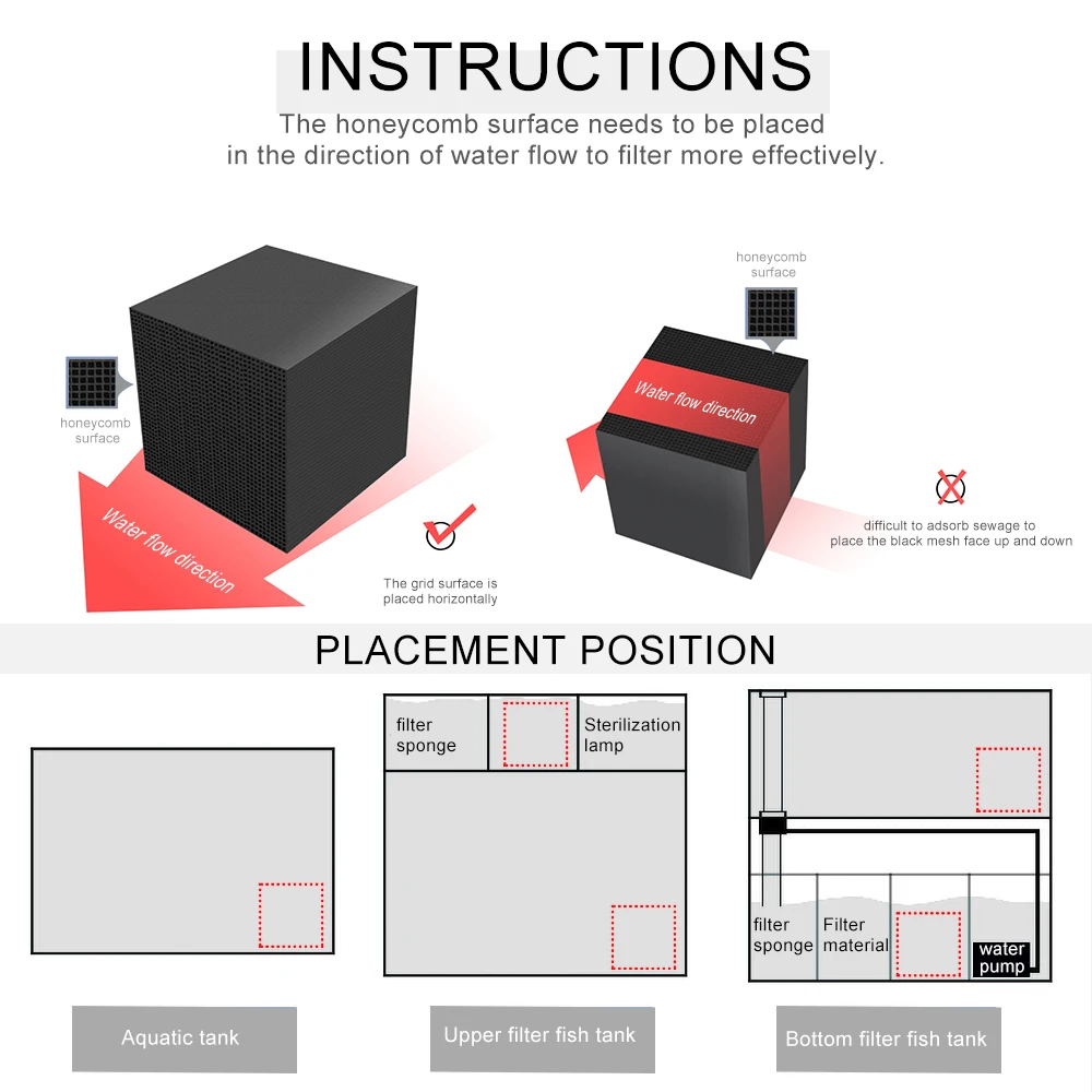 Сотовая конструкция, ультра-абсорбционный блок активированного угля, твердый состав, без порошка, без примесей, не вызовет черную воду. Ультра сильная фильтрация и поглощение.