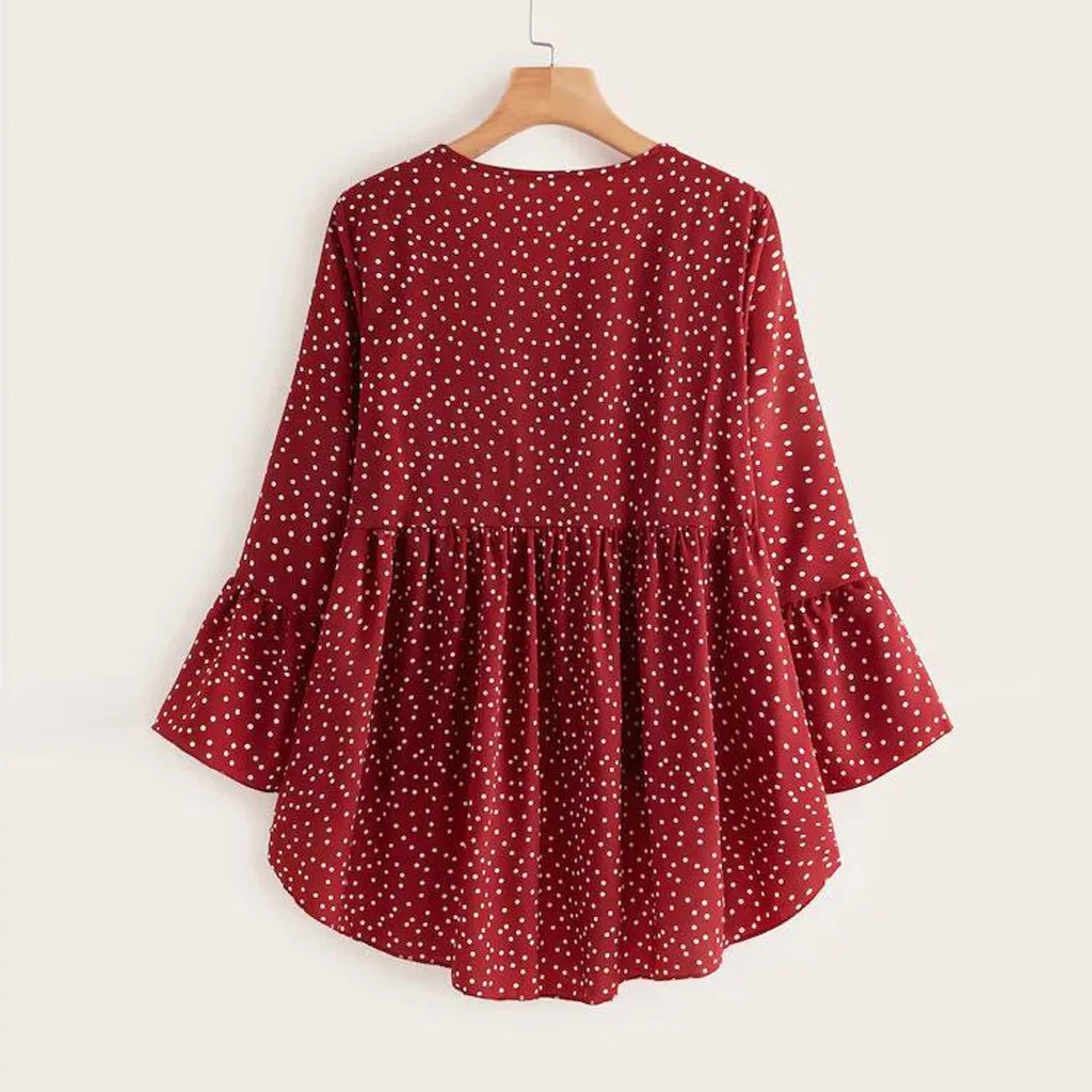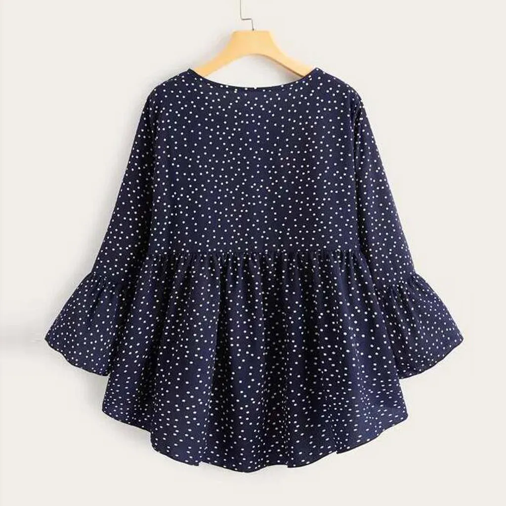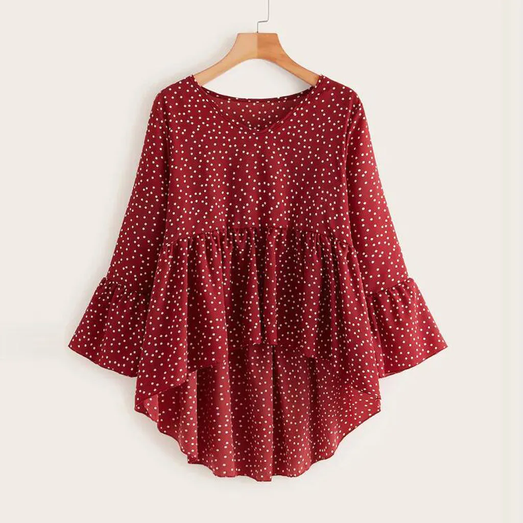 1. особенности: повседневные топы; v-образный вырез; узор в горошек; длинный рукав; пуловер; футболка; оборки; рукава с воланом; блузка с баской; повседневные топы; повседневная одежда; стильный и модный дизайн; Осенняя Повседневная блузка.