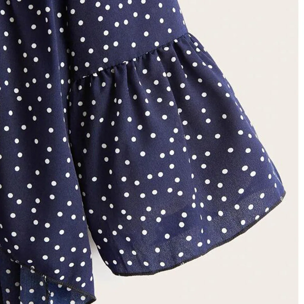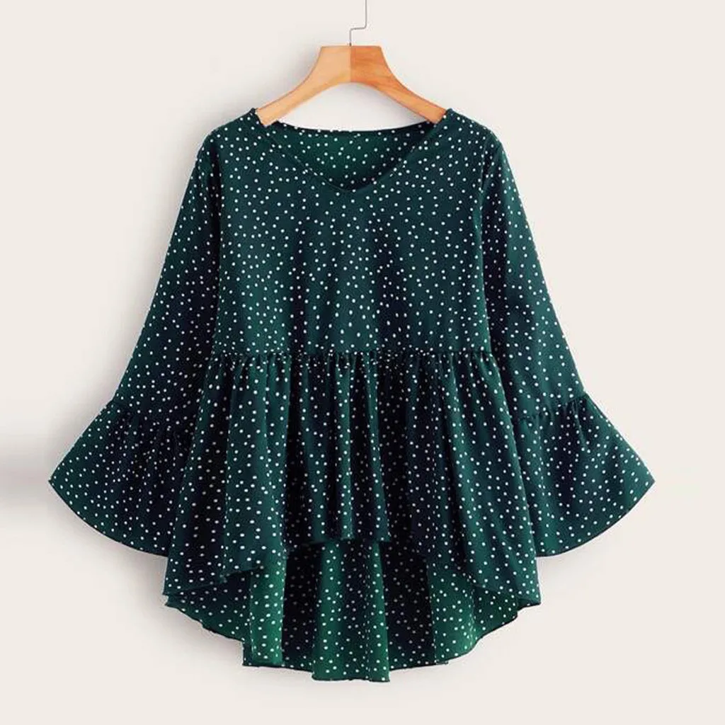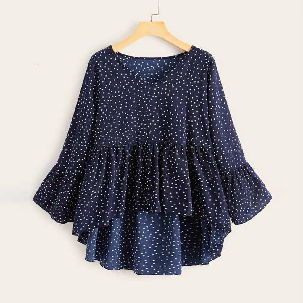 1. особенности: повседневные топы; v-образный вырез; узор в горошек; длинный рукав; пуловер; футболка; оборки; рукава с воланом; блузка с баской; повседневные топы; повседневная одежда; стильный и модный дизайн; Осенняя Повседневная блузка.